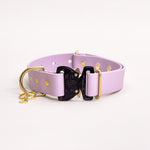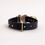 Our quick release collars are made from standard weight Biothane, which allows them to be adjustable in size. This makes the fit of these collars much more forgiving than a traditional belt-buckle style collar! Each collar features two button studs that keep the adjustment mechanism of the collar in place. The buckles are available in black in 3/4” and 1”, and coyote brown in 1”. The rest of the hardware on the collar is available in your choice or brass or chrome. Each collar is finished with a Strange Tails moon charm to match your hardware selection.