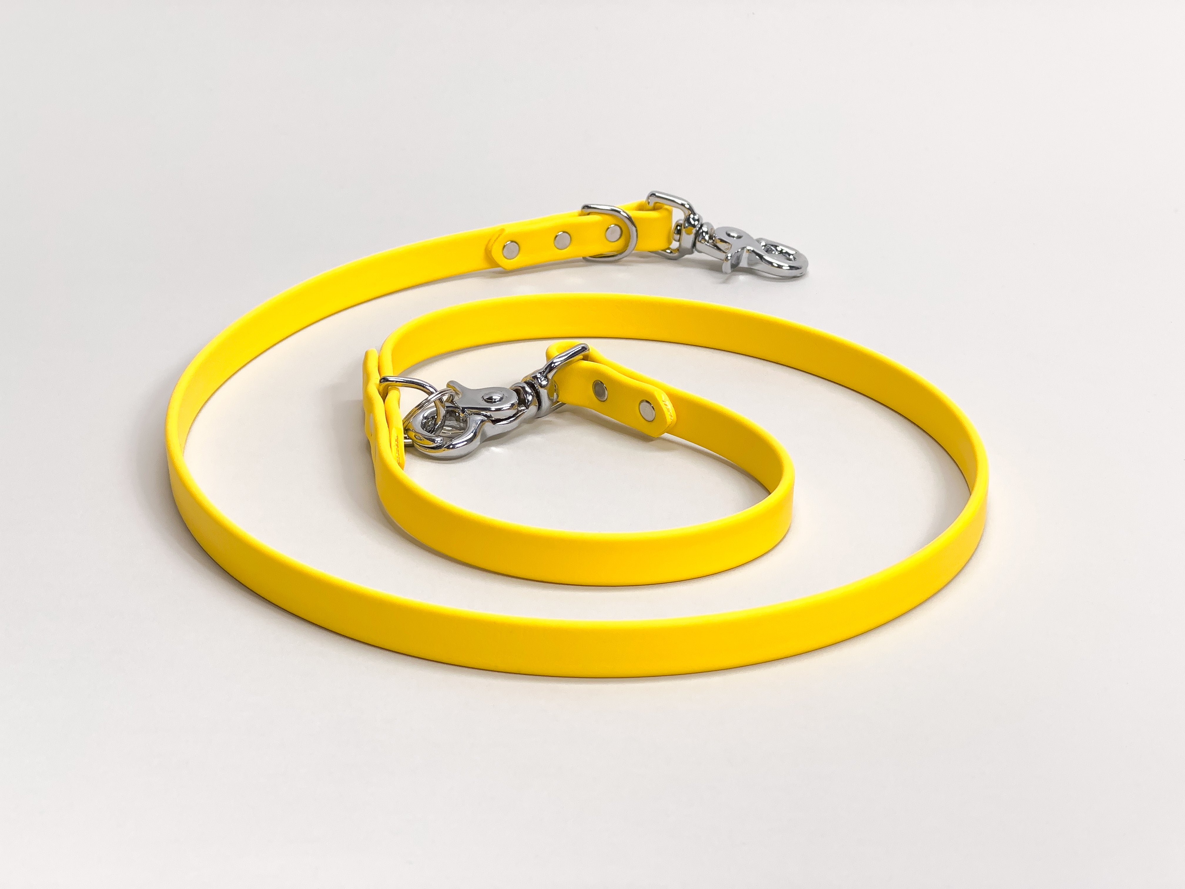 We use the "Super Heavy" Biothane for all of our leashes, handsfree adapters, classic collars and martingale collars which has a substantial and luxe feel to it. Our adjustable quick release collars use the "Standard" Biothane.