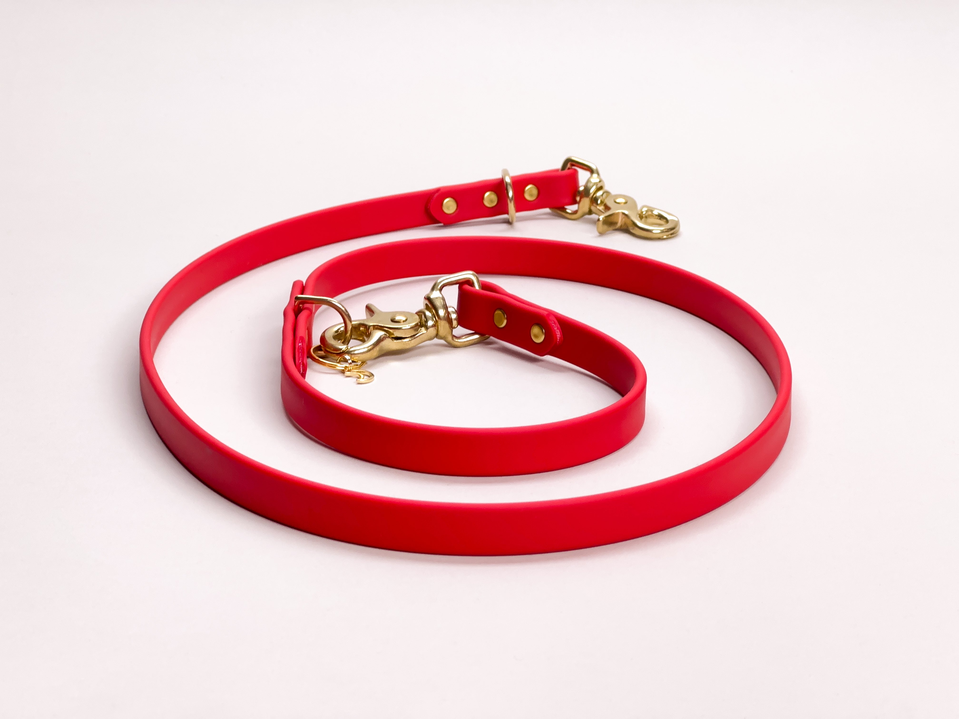 We use the "Super Heavy" Biothane for all of our leashes, handsfree adapters, classic collars and martingale collars which has a substantial and luxe feel to it. Our adjustable quick release collars use the "Standard" Biothane.