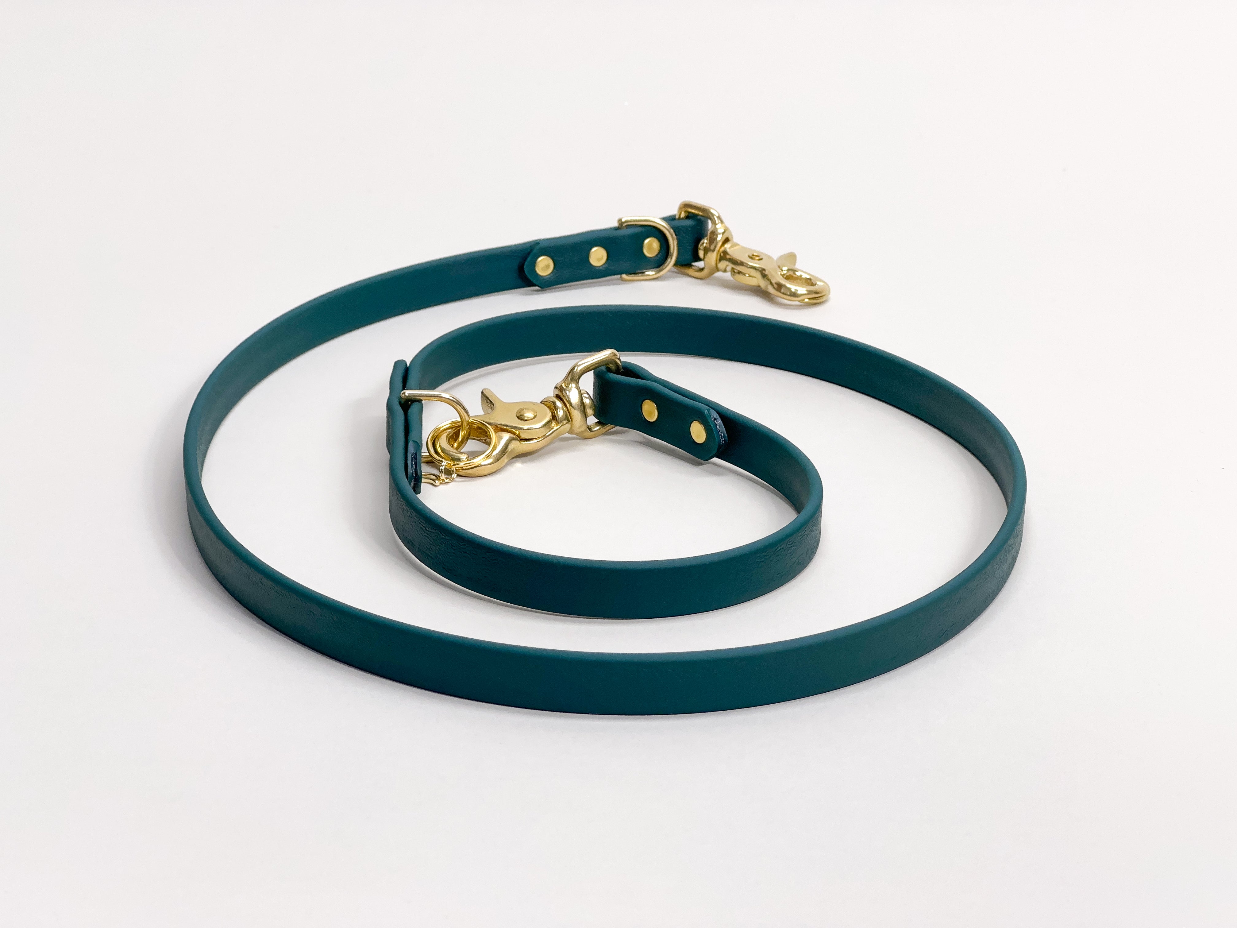 We use the "Super Heavy" Biothane for all of our leashes, handsfree adapters, classic collars and martingale collars which has a substantial and luxe feel to it. Our adjustable quick release collars use the "Standard" Biothane.