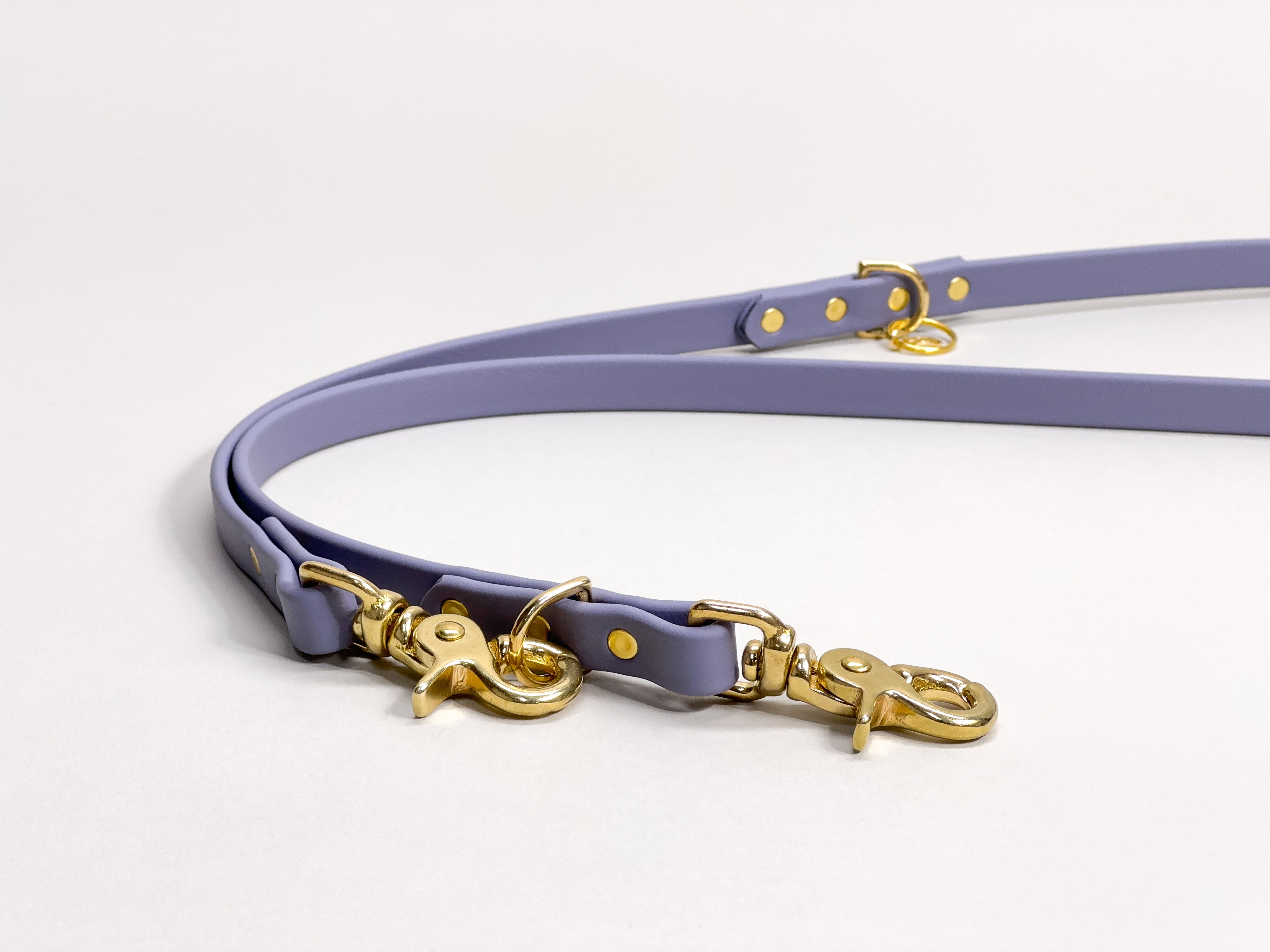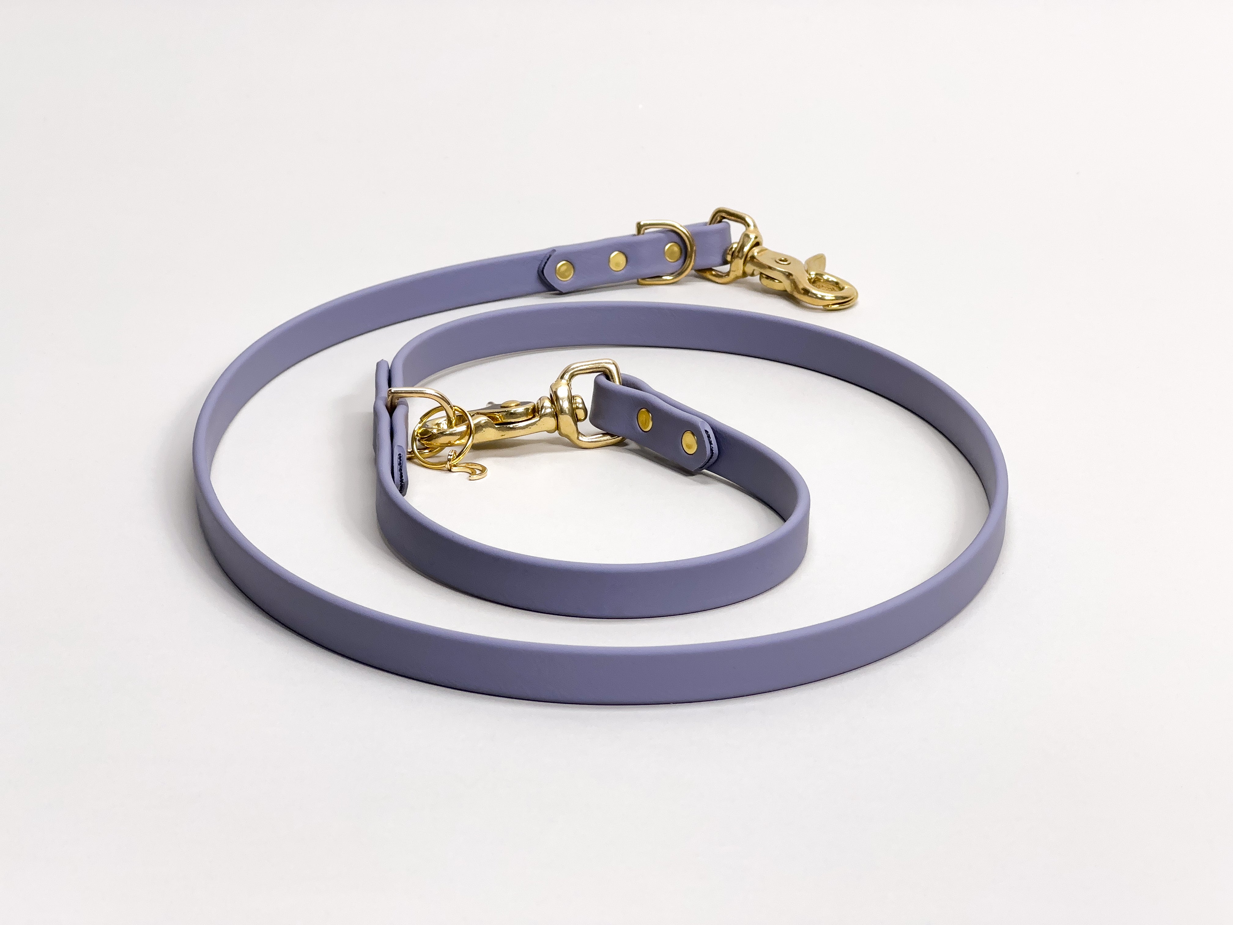 We use the "Super Heavy" Biothane for all of our leashes, handsfree adapters, classic collars and martingale collars which has a substantial and luxe feel to it. Our adjustable quick release collars use the "Standard" Biothane.
