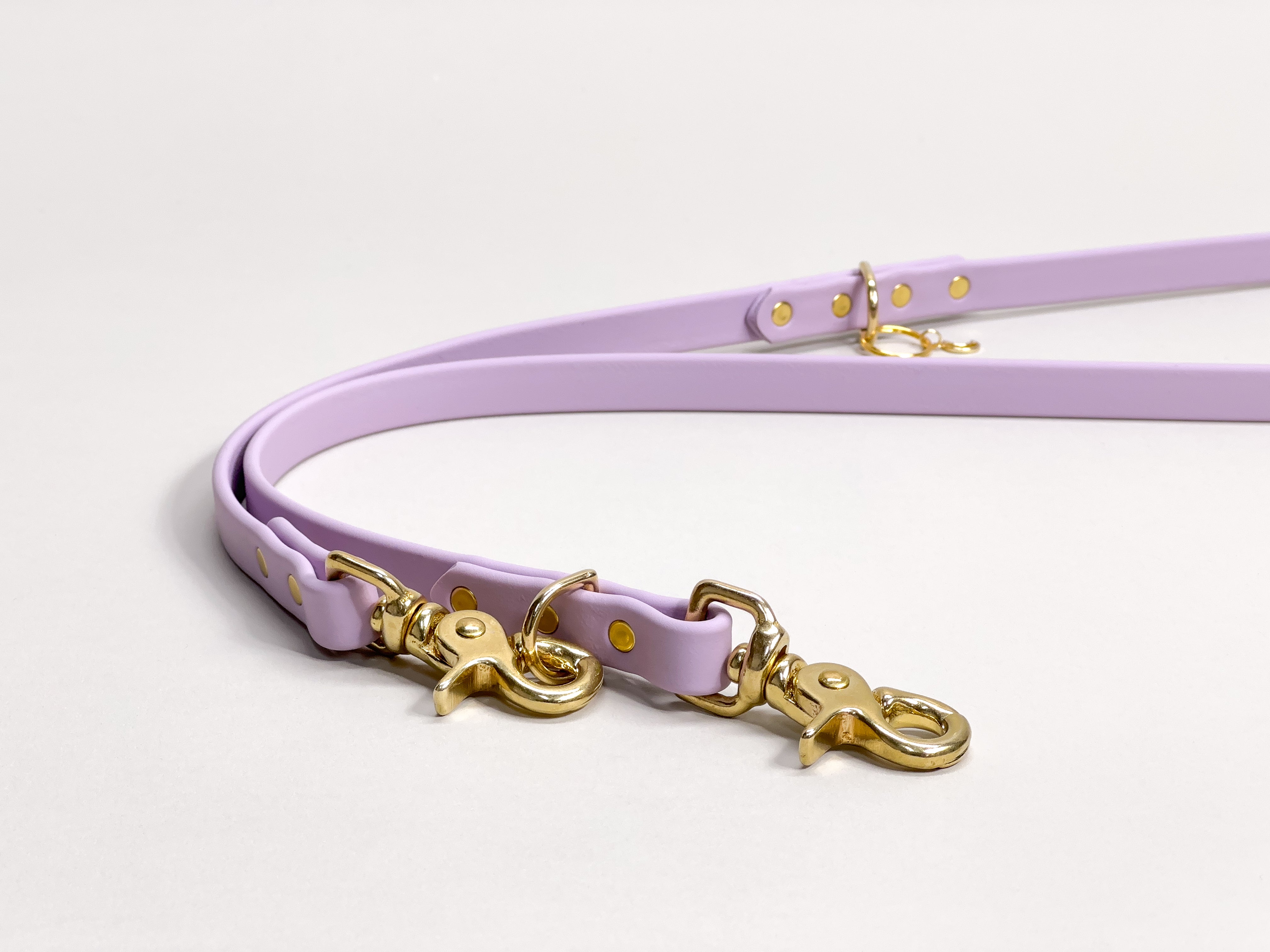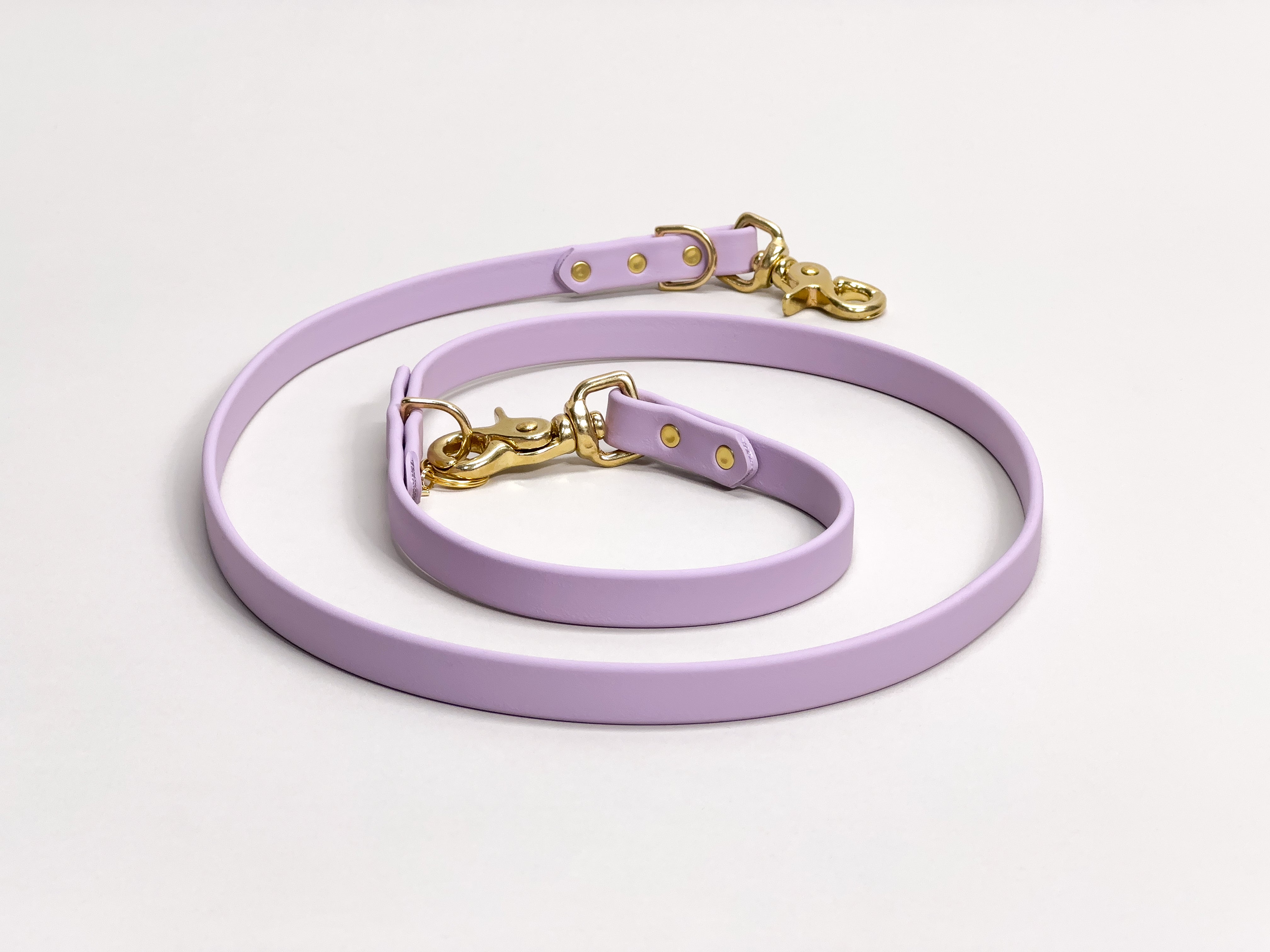 We use the "Super Heavy" Biothane for all of our leashes, handsfree adapters, classic collars and martingale collars which has a substantial and luxe feel to it. Our adjustable quick release collars use the "Standard" Biothane.