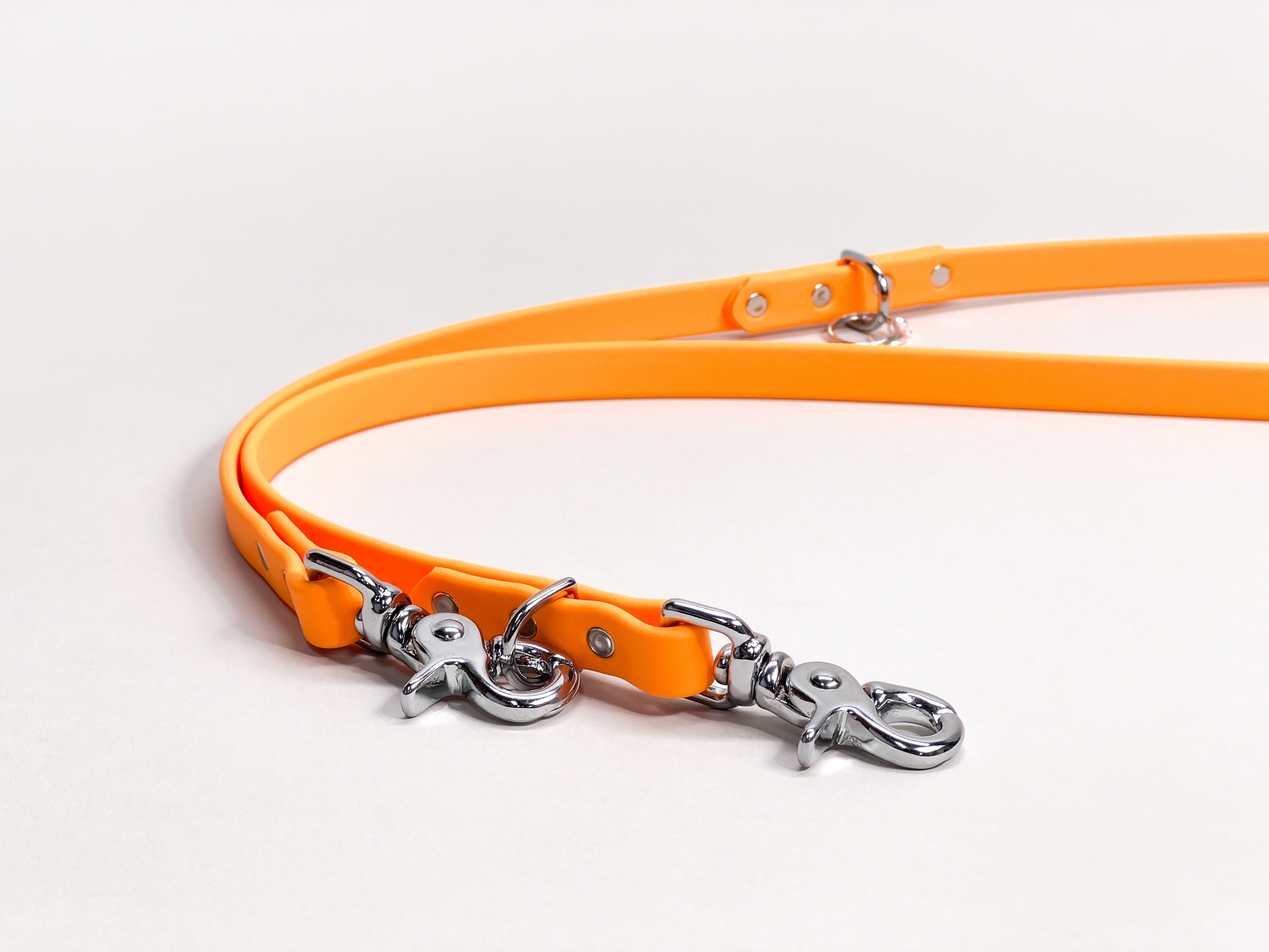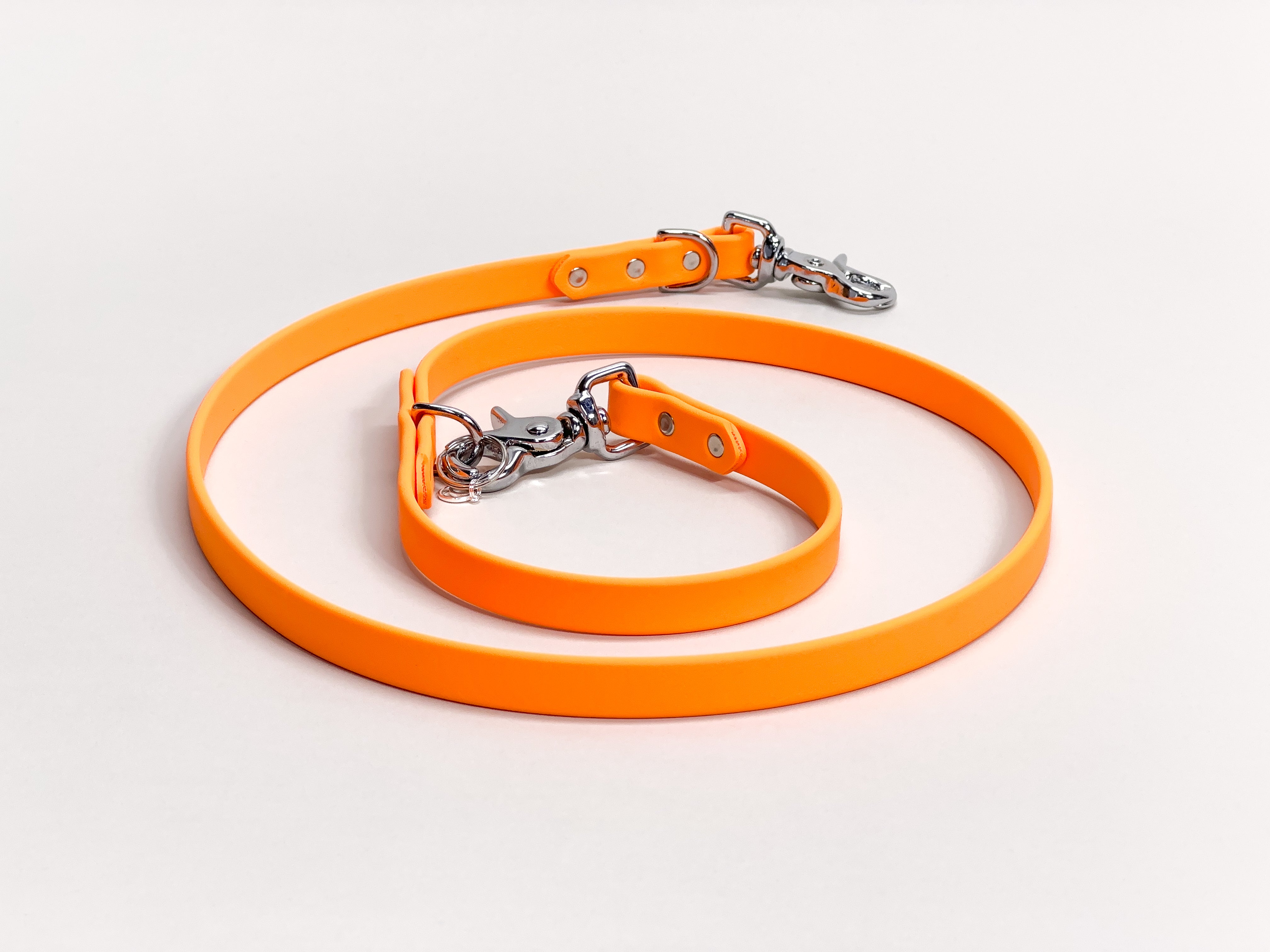 We use the "Super Heavy" Biothane for all of our leashes, handsfree adapters, classic collars and martingale collars which has a substantial and luxe feel to it. Our adjustable quick release collars use the "Standard" Biothane.