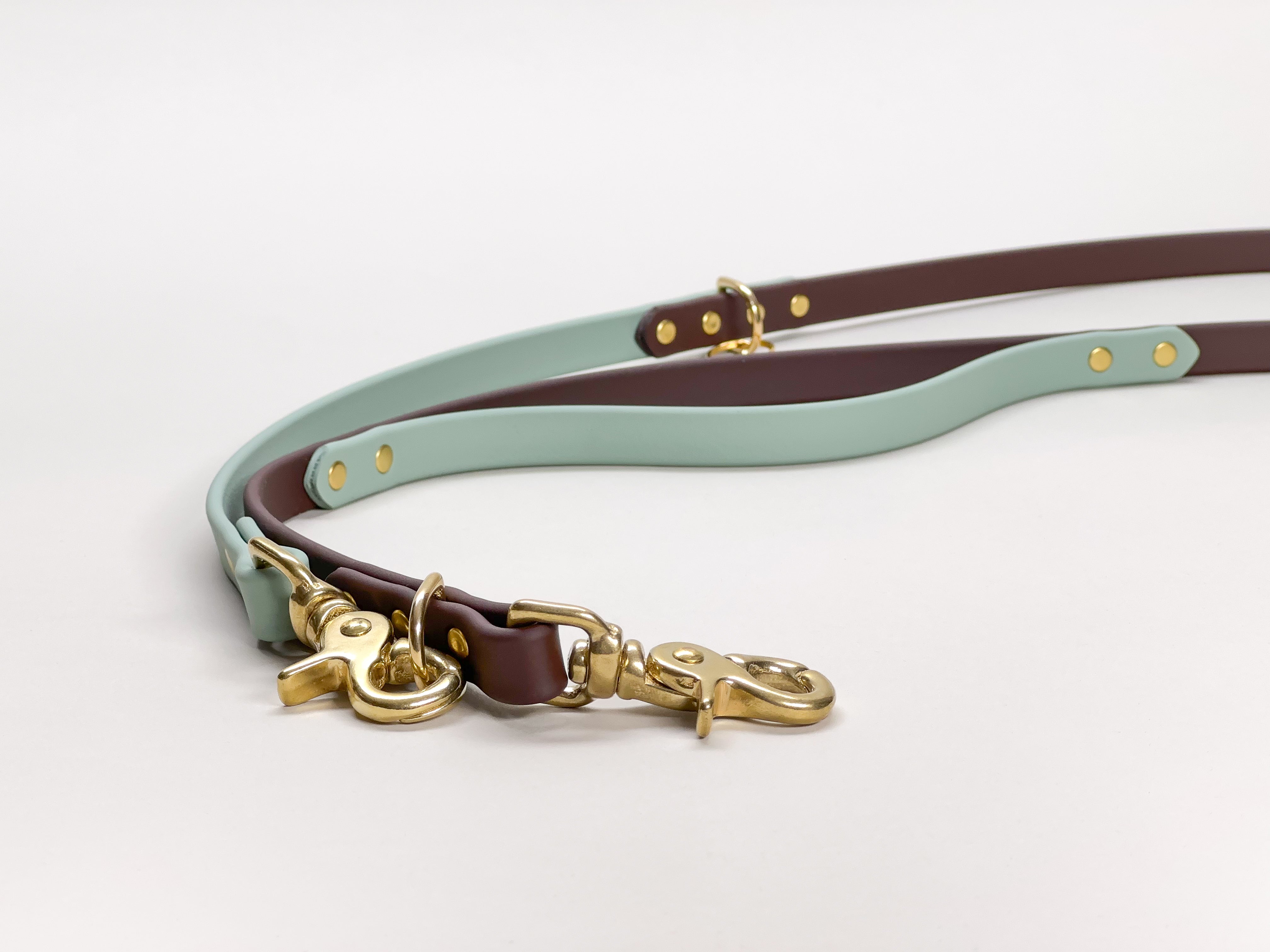 - 5/8” Traffic Handle Leash, brass hardware, 4ft length, main colour: Espresso, handle colour: Sage