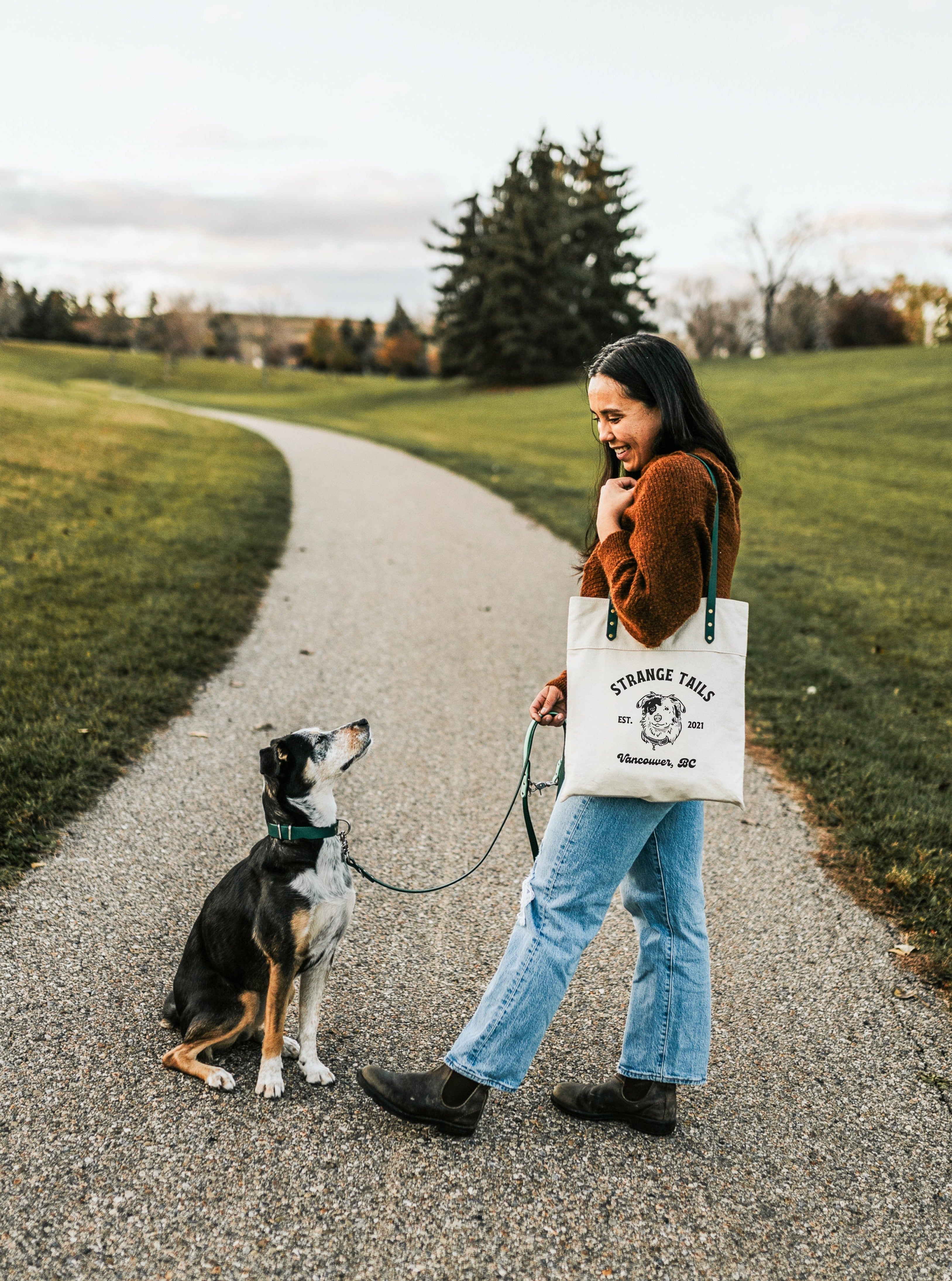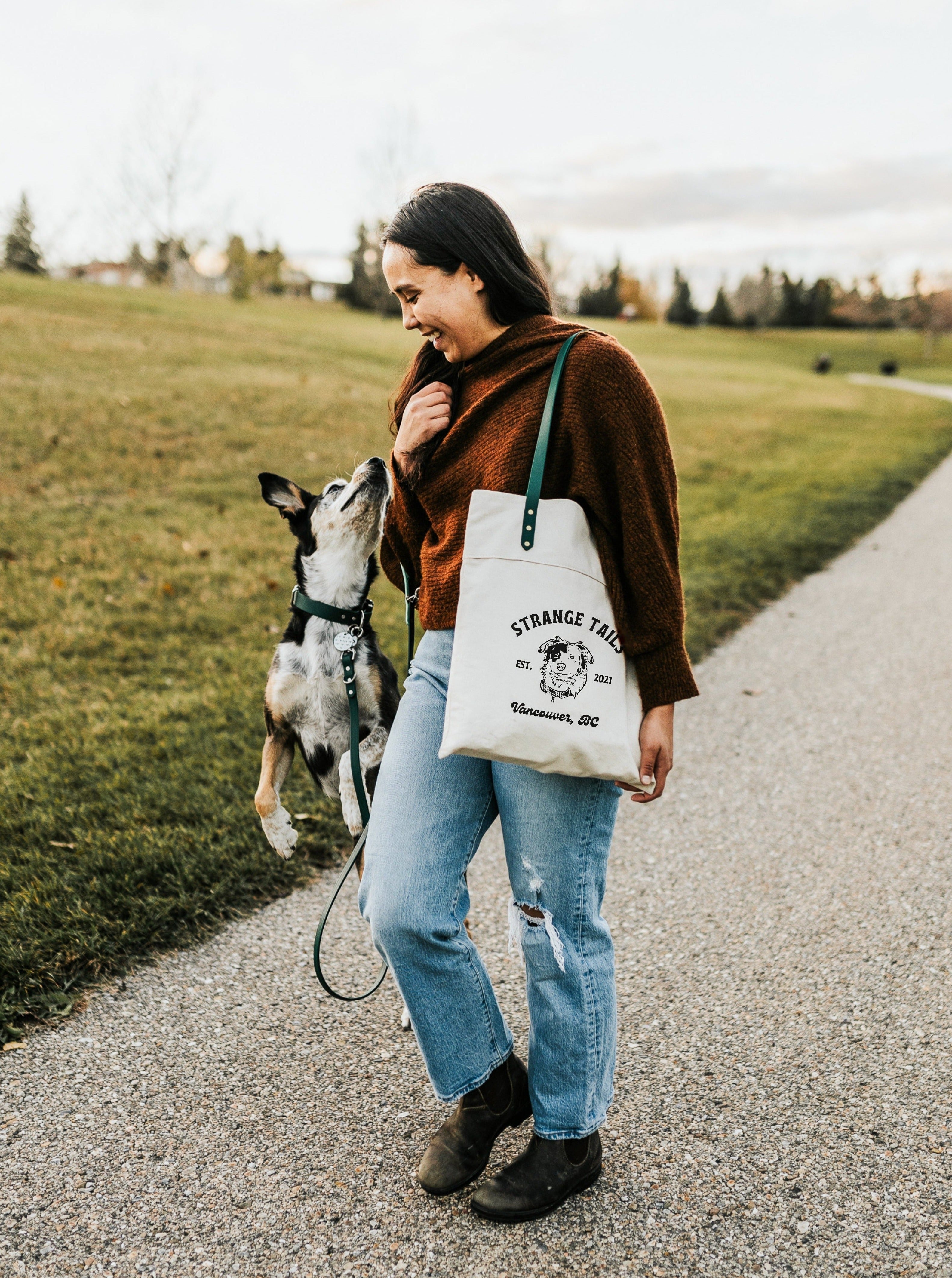 Our tote bags are handmade and sewn in-house, featuring an interior pocket and biothane handles so you can match your pup’s gear!