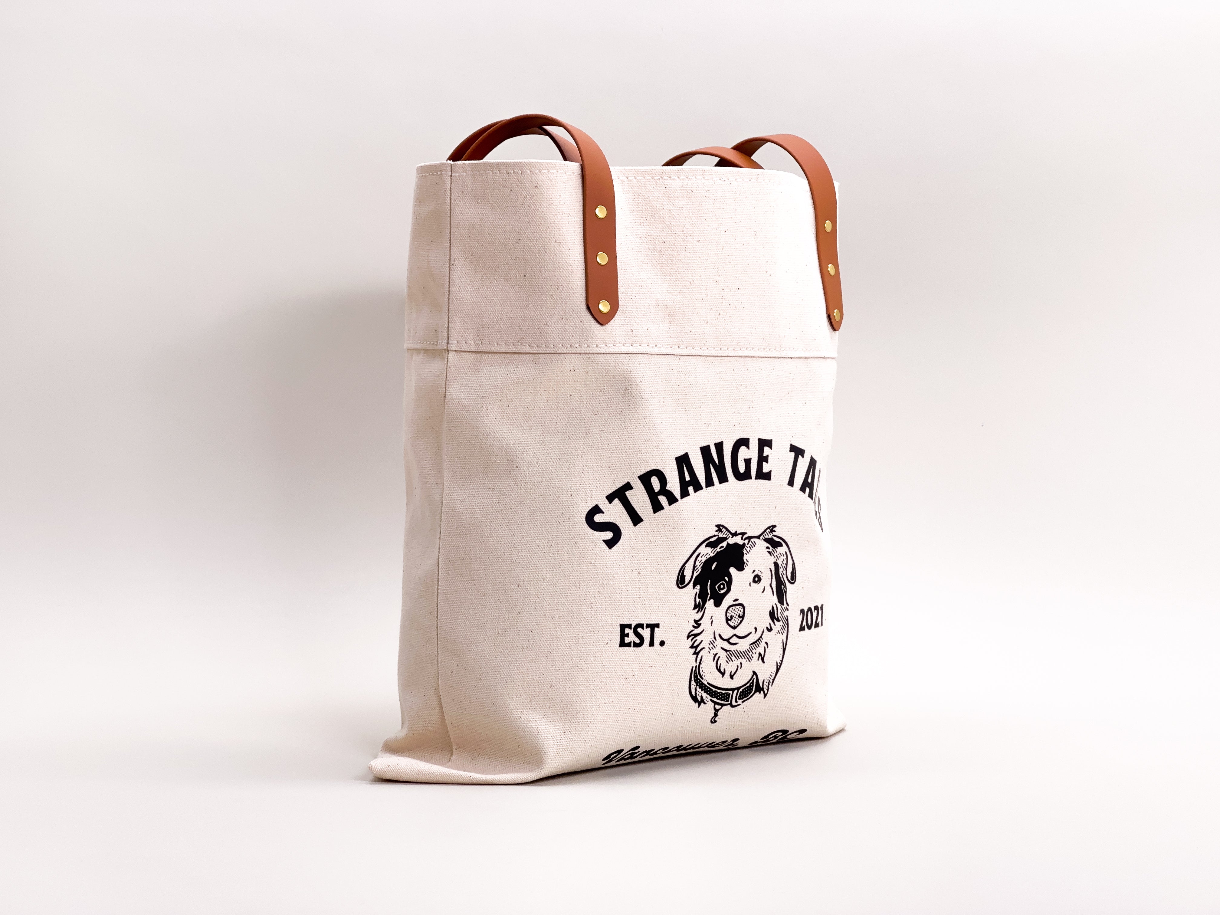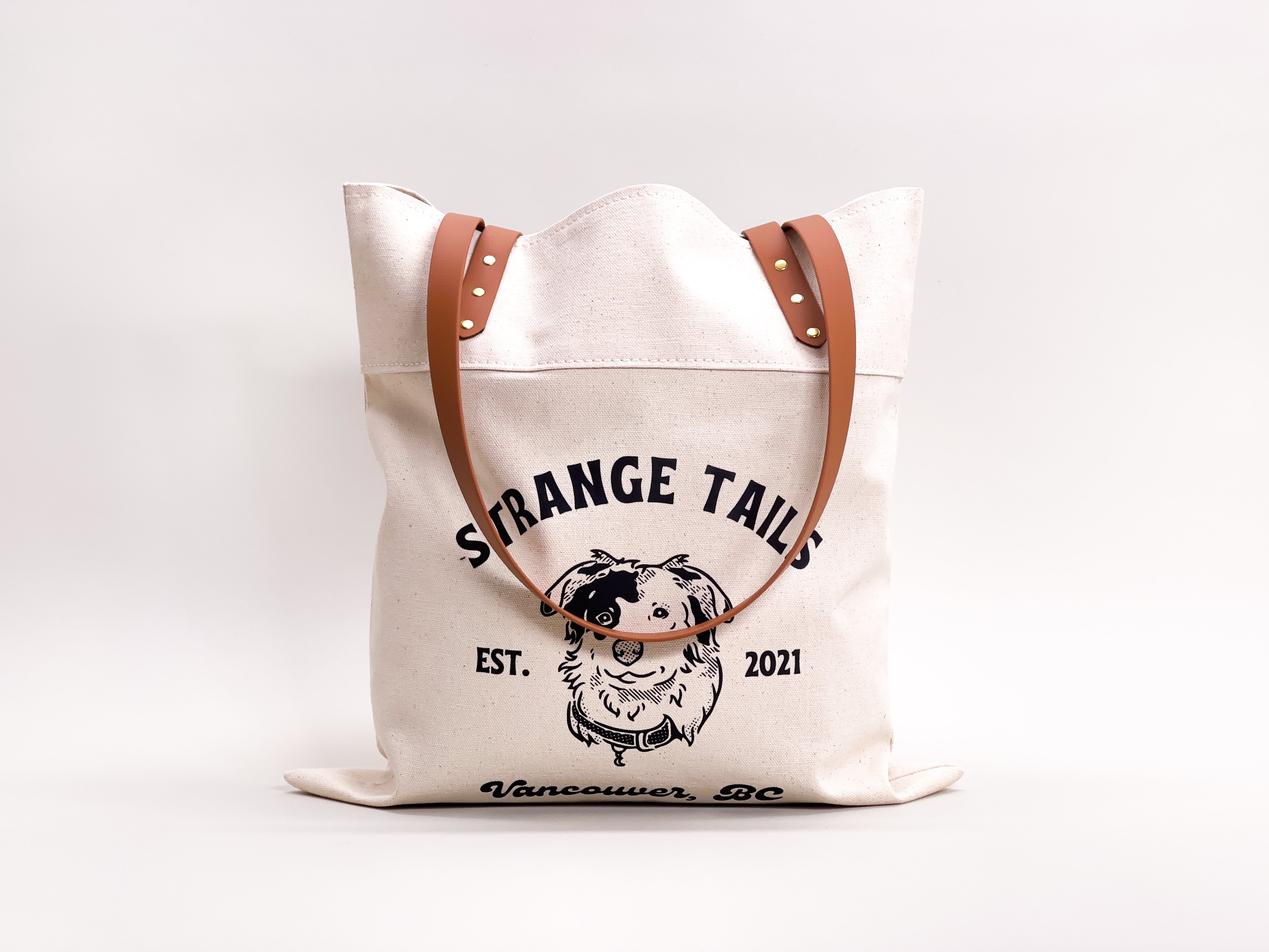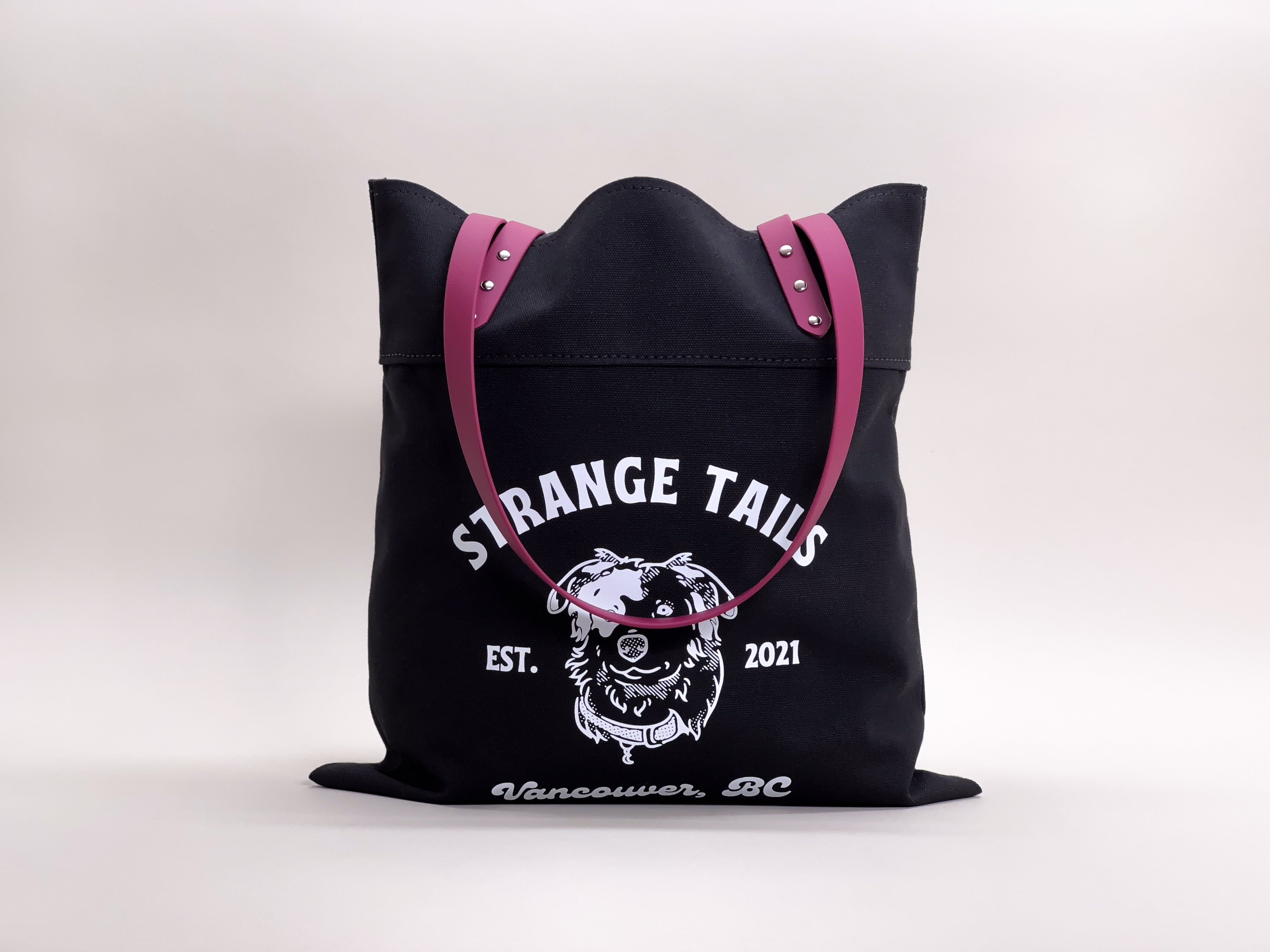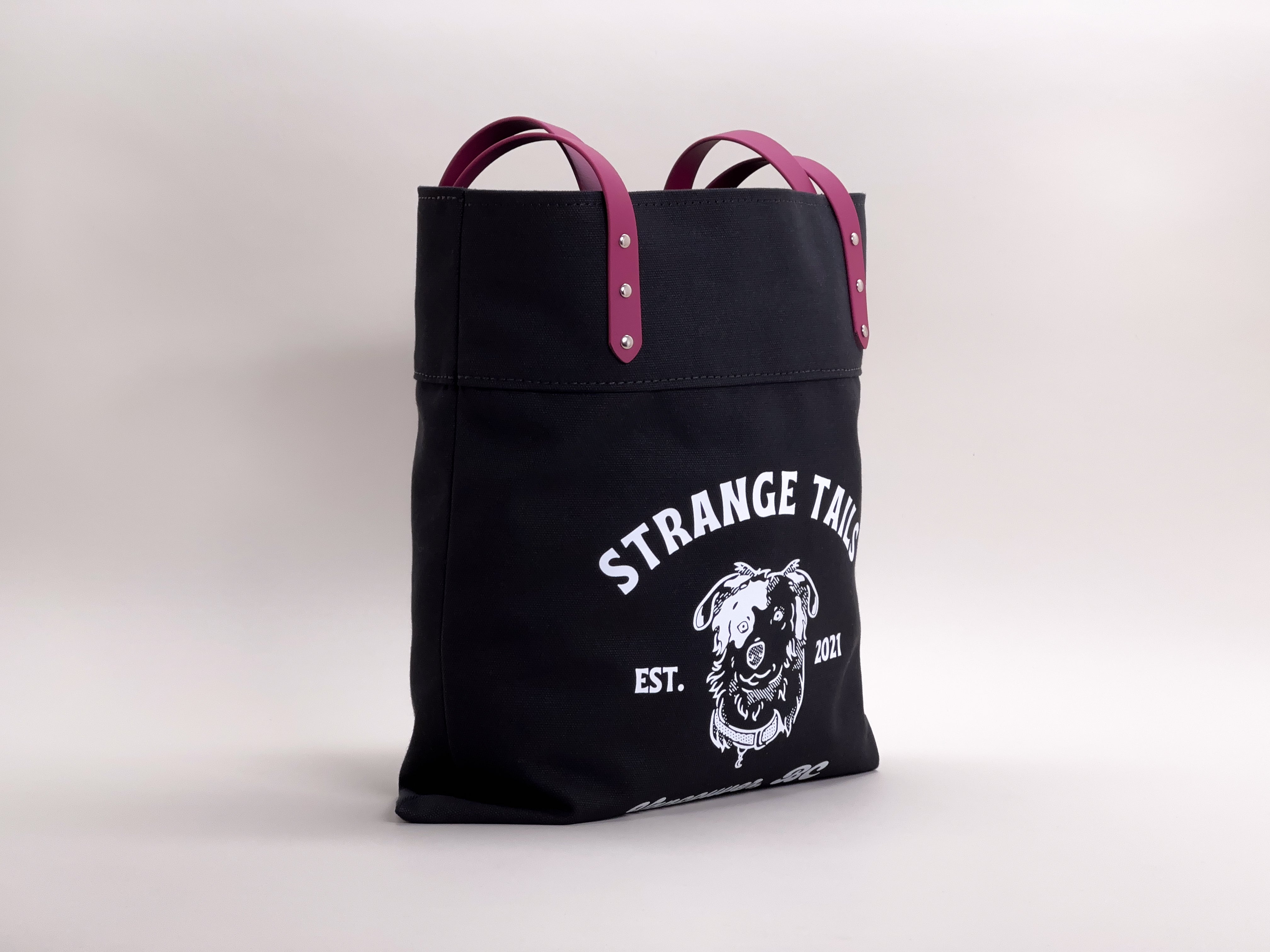 You can customize your bag by choosing the handle colours, brass or chrome rivets, and from natural or black heavyweight canvas. The tote is finished with a Strange Tails logo on the front.