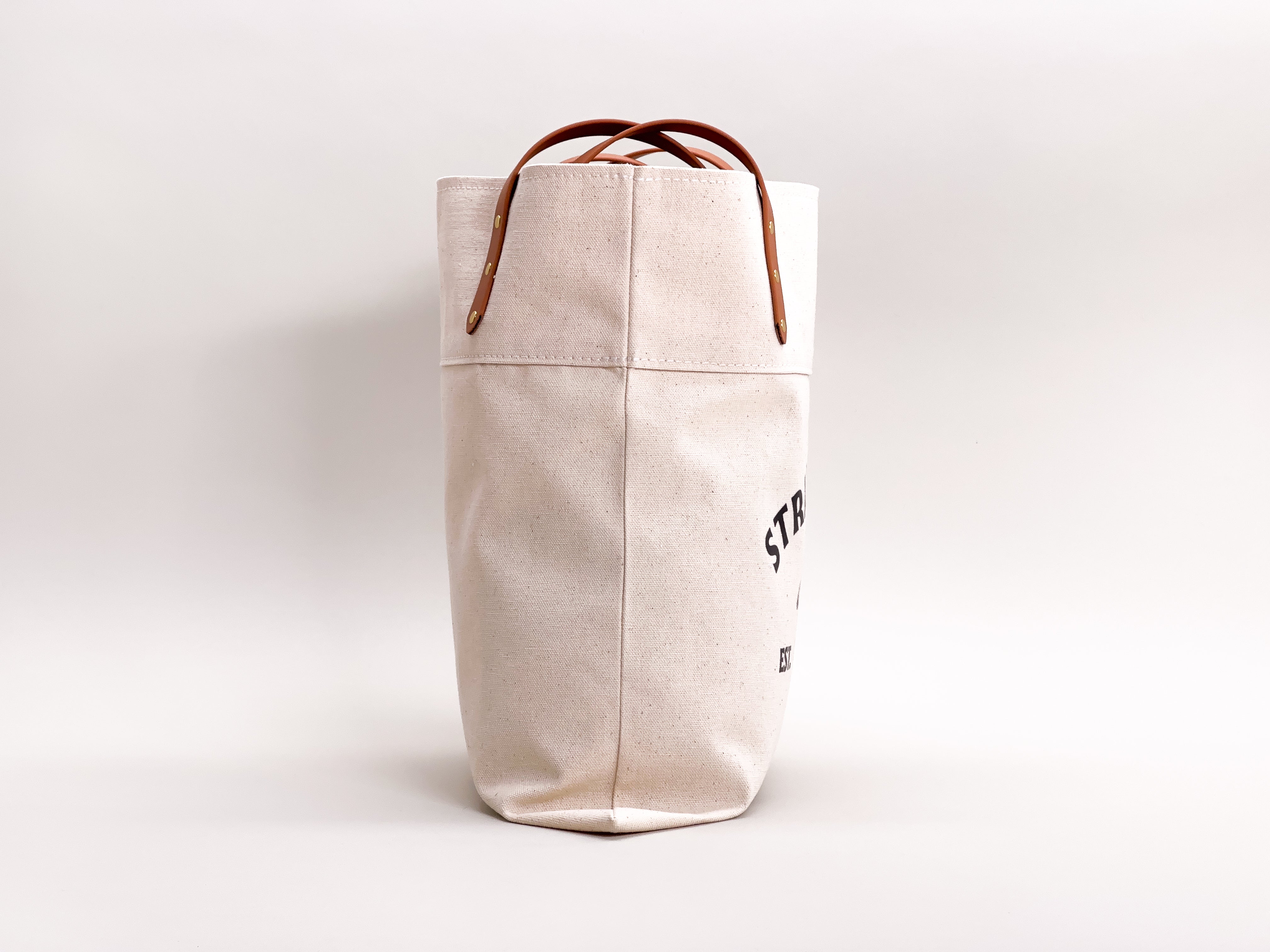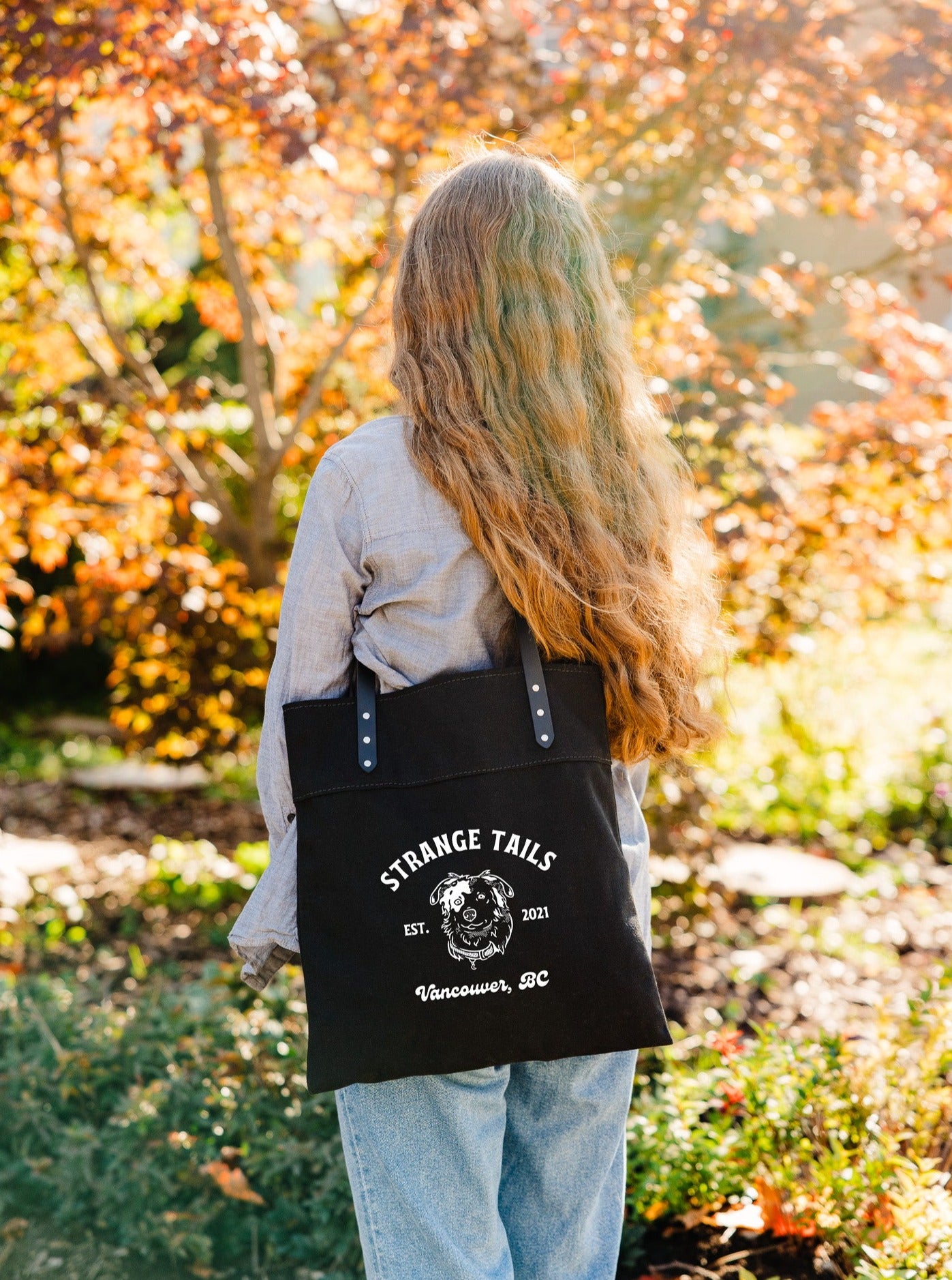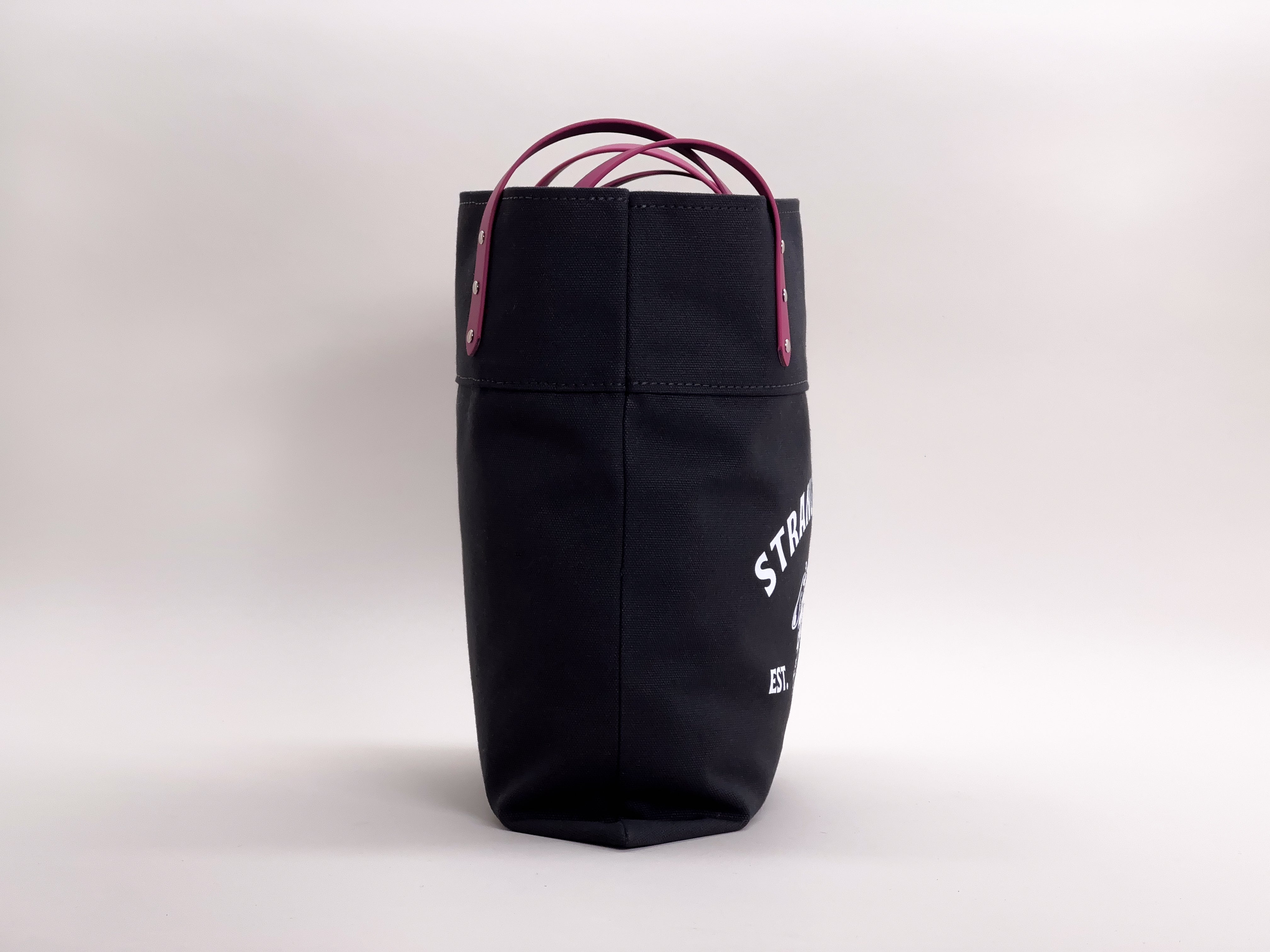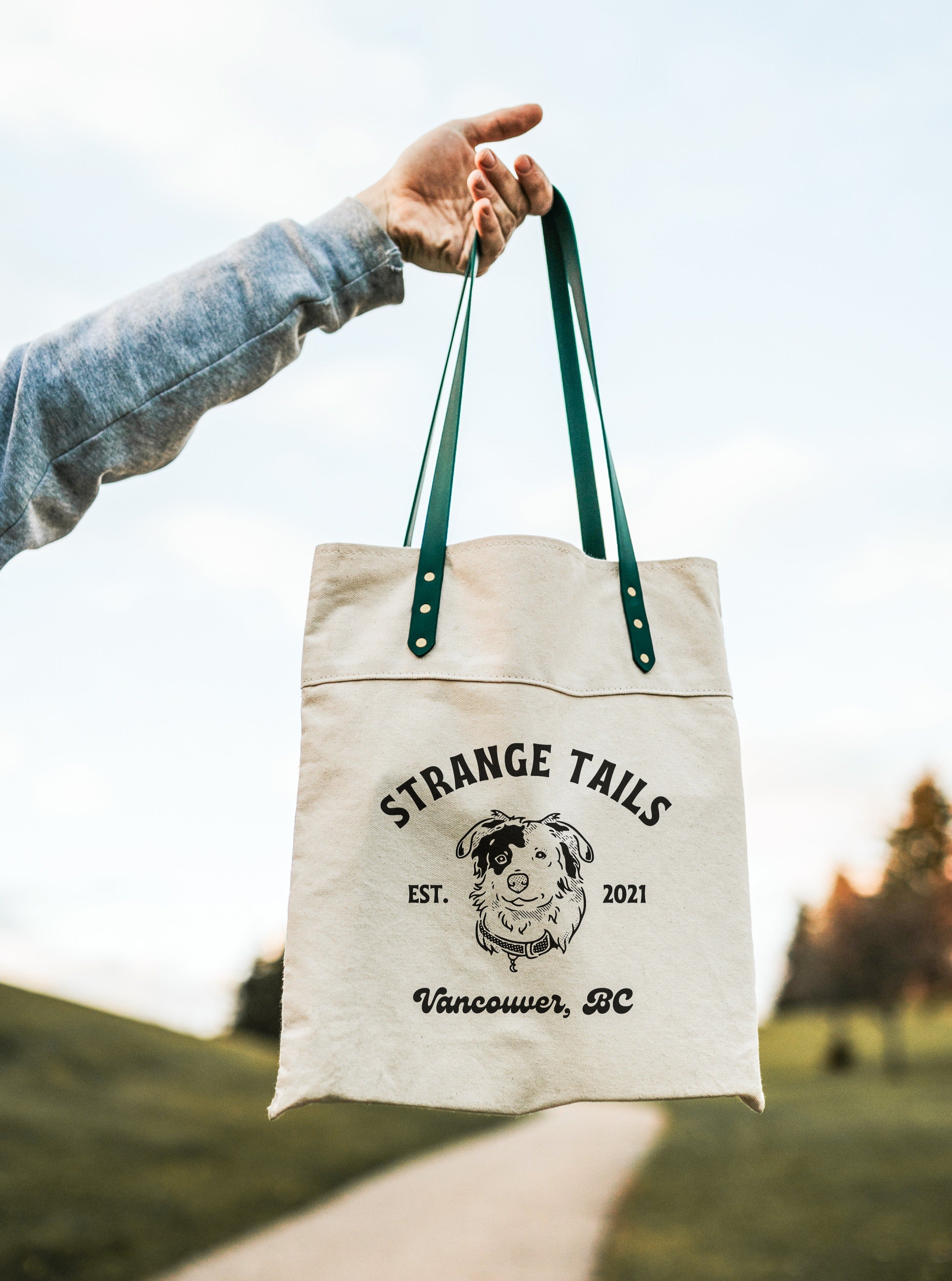 You can customize your bag by choosing the handle colours, brass or chrome rivets, and from natural or black heavyweight canvas. The tote is finished with a Strange Tails logo on the front.