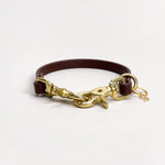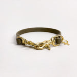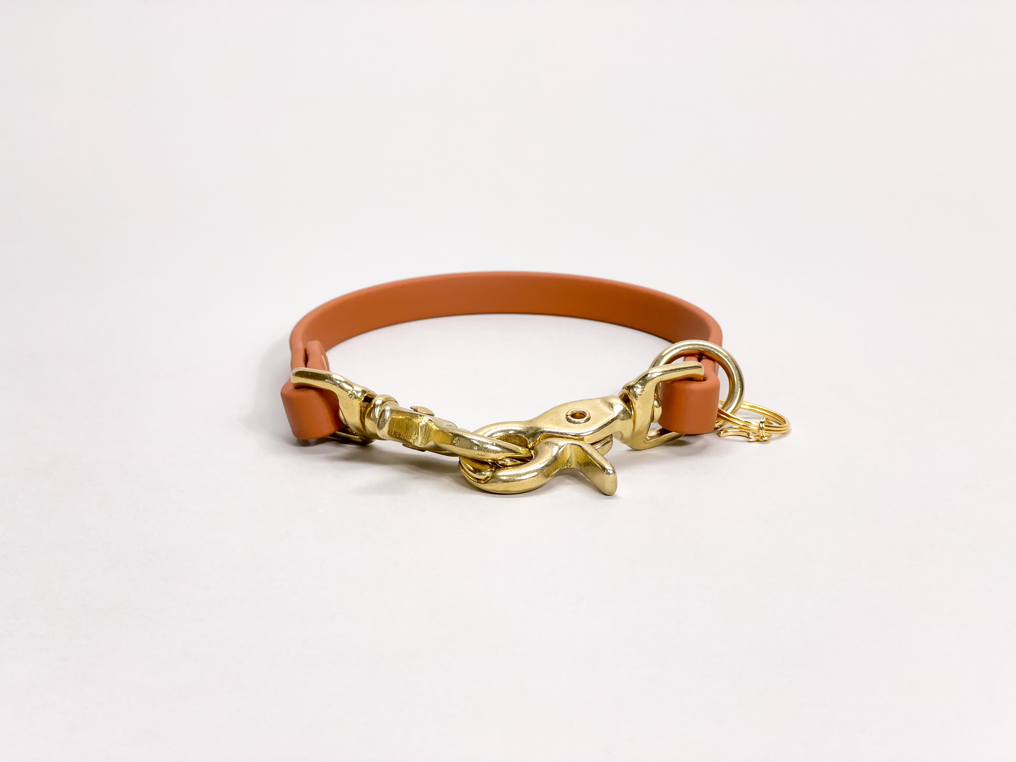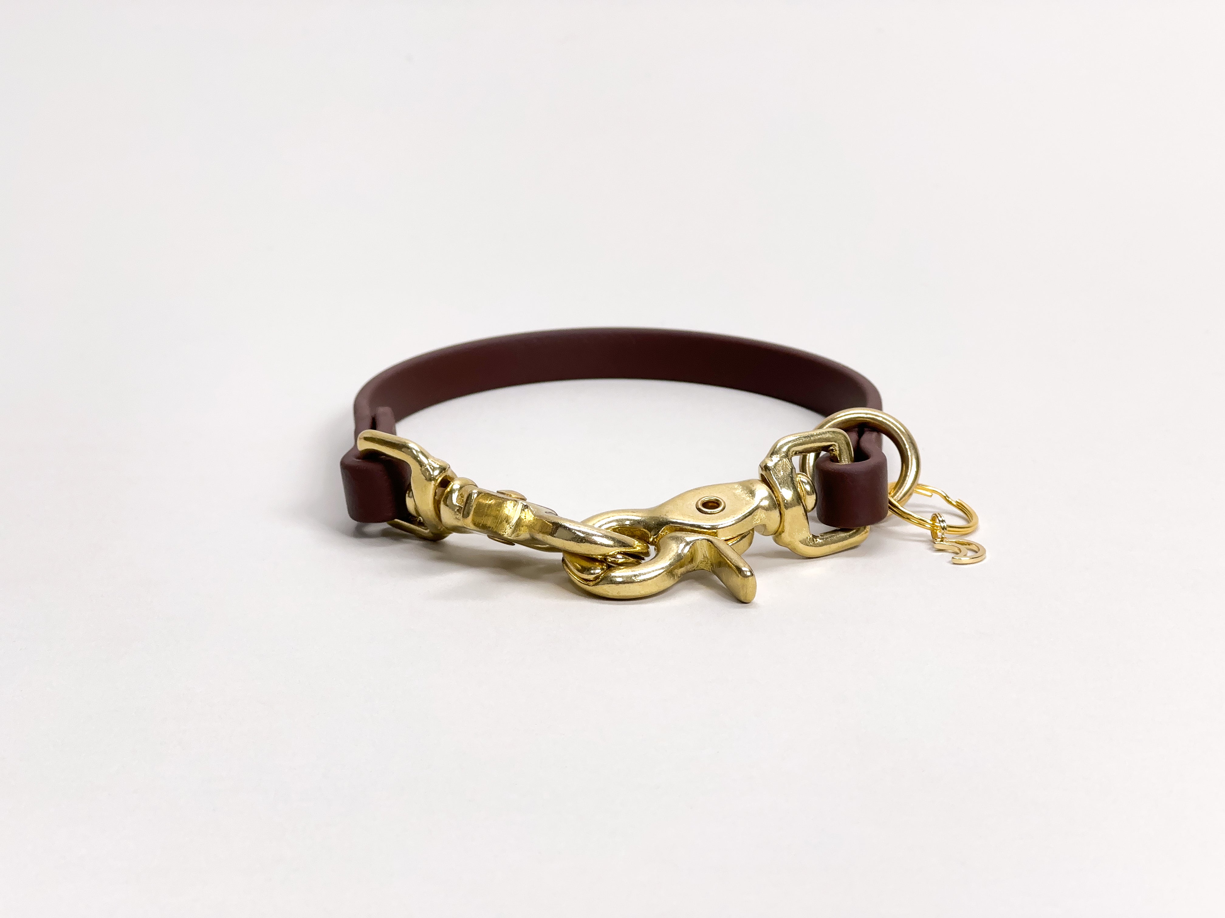 Solid brass hardware naturally oxidizes as it ages. It can leave tarnish marks against the biothane, especially on the lighter colours.
