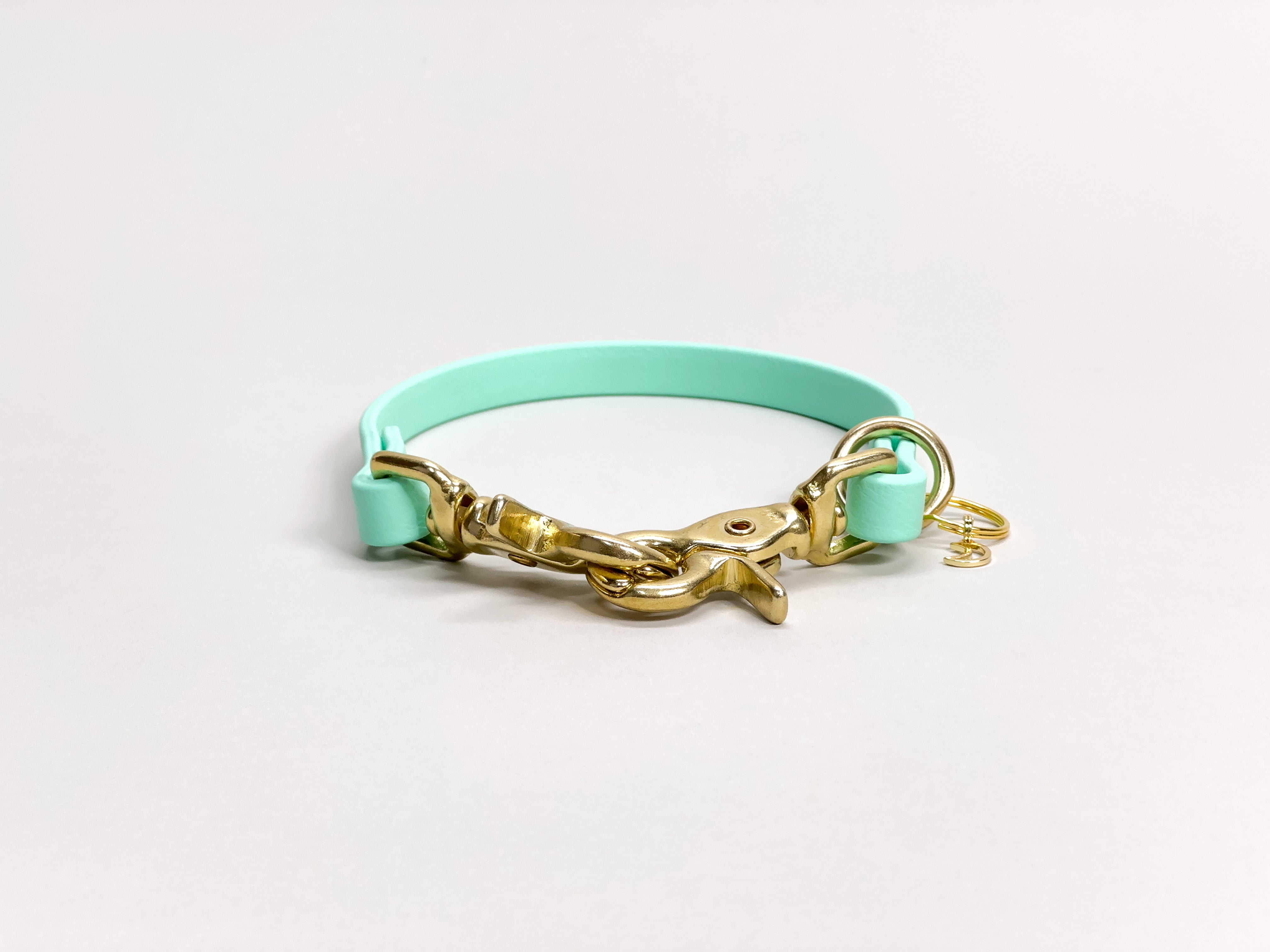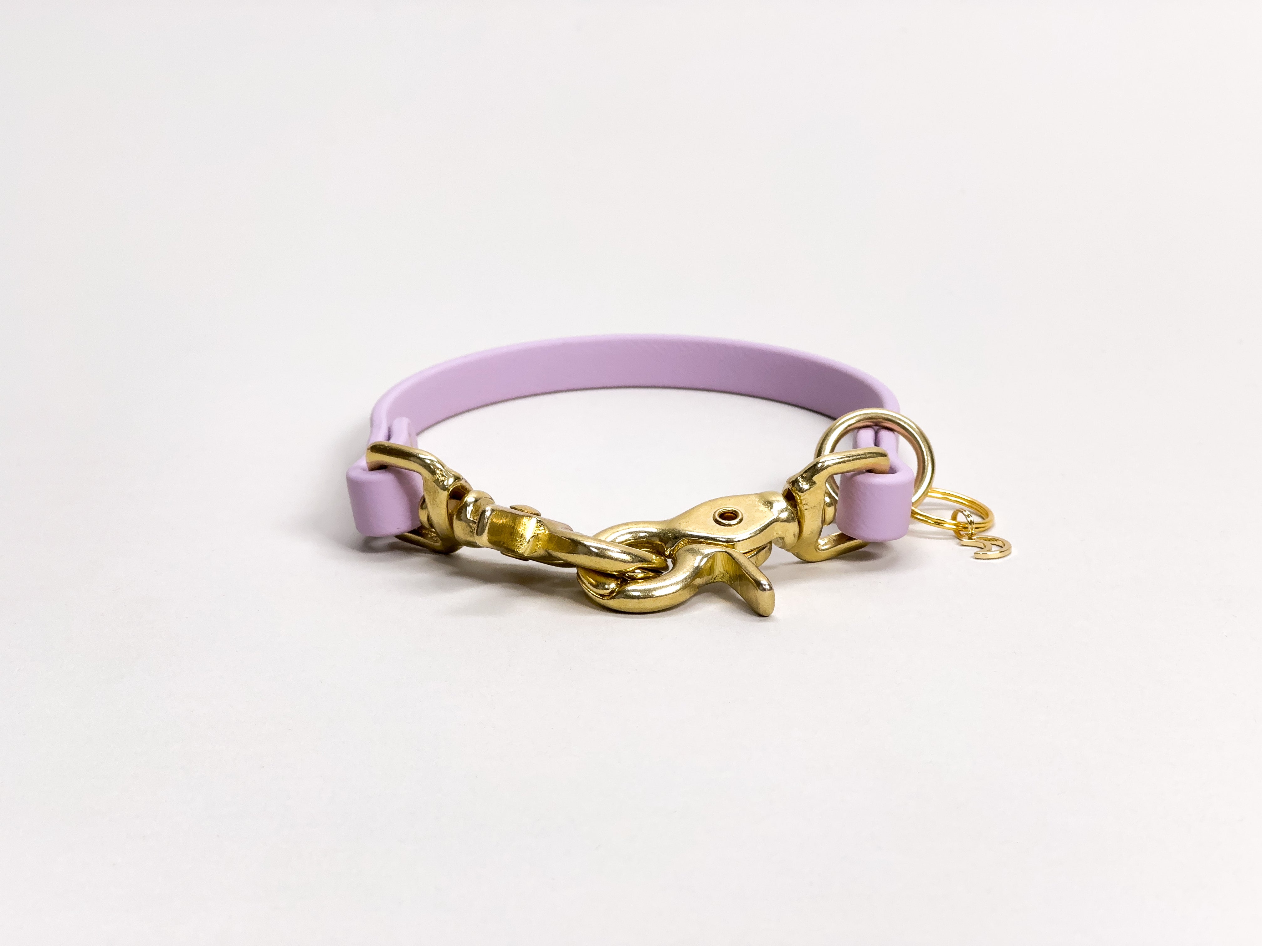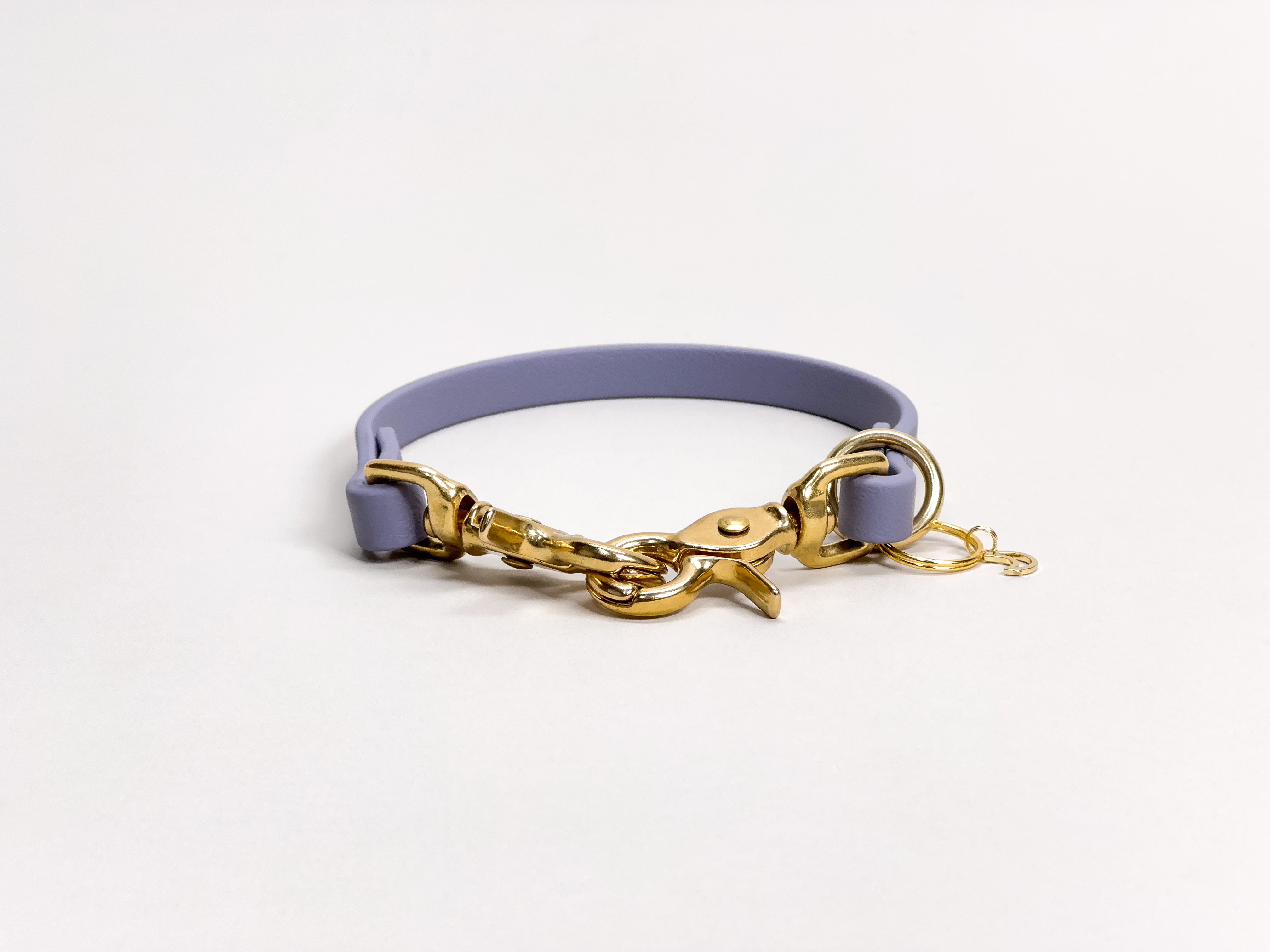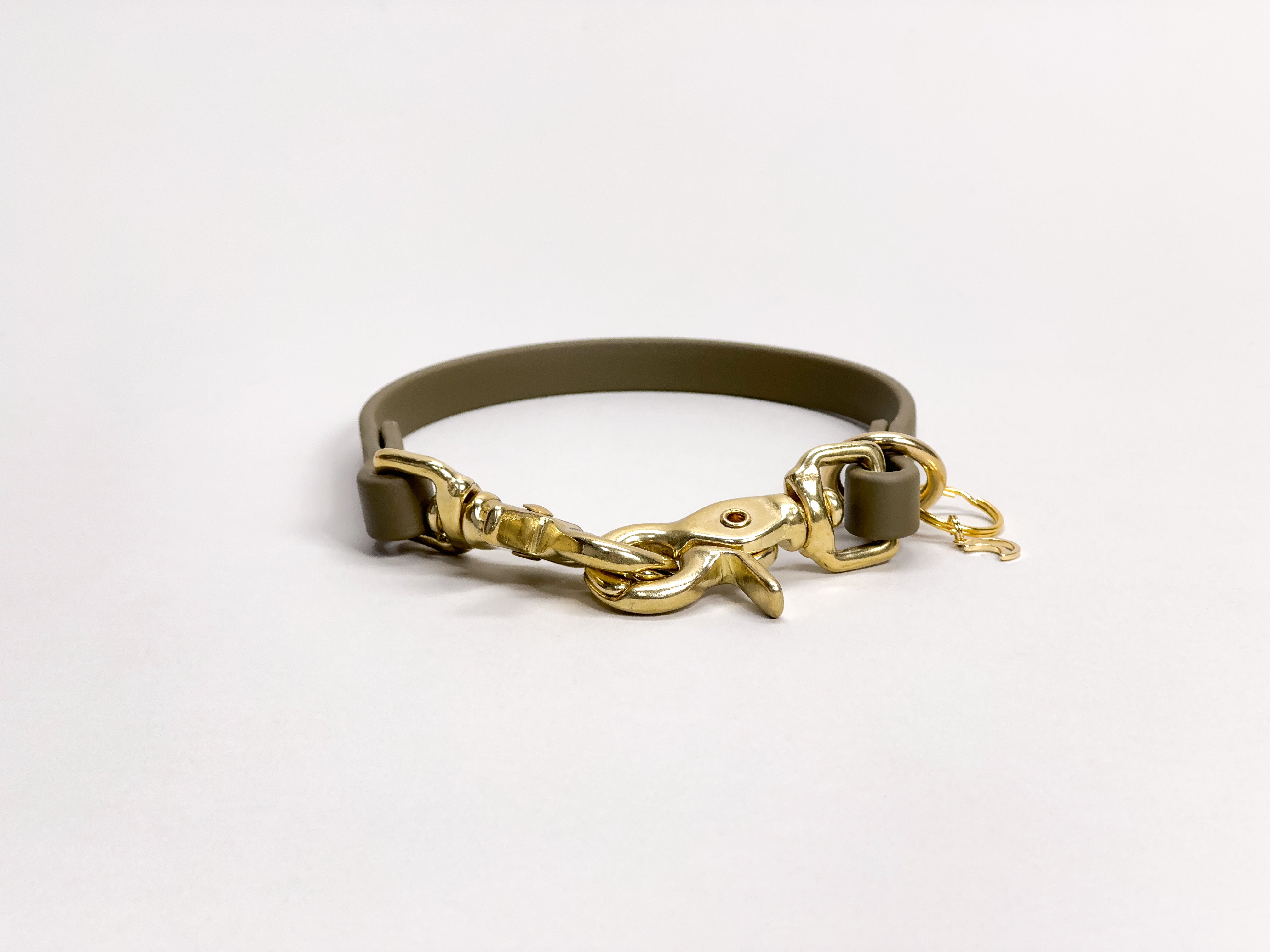 We use the "Super Heavy" Biothane for all of our leashes, handsfree adapters, classic collars and martingale collars which has a substantial and luxe feel to it. Our adjustable quick release collars use the "Standard" Biothane.