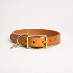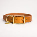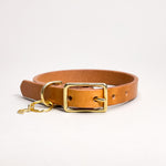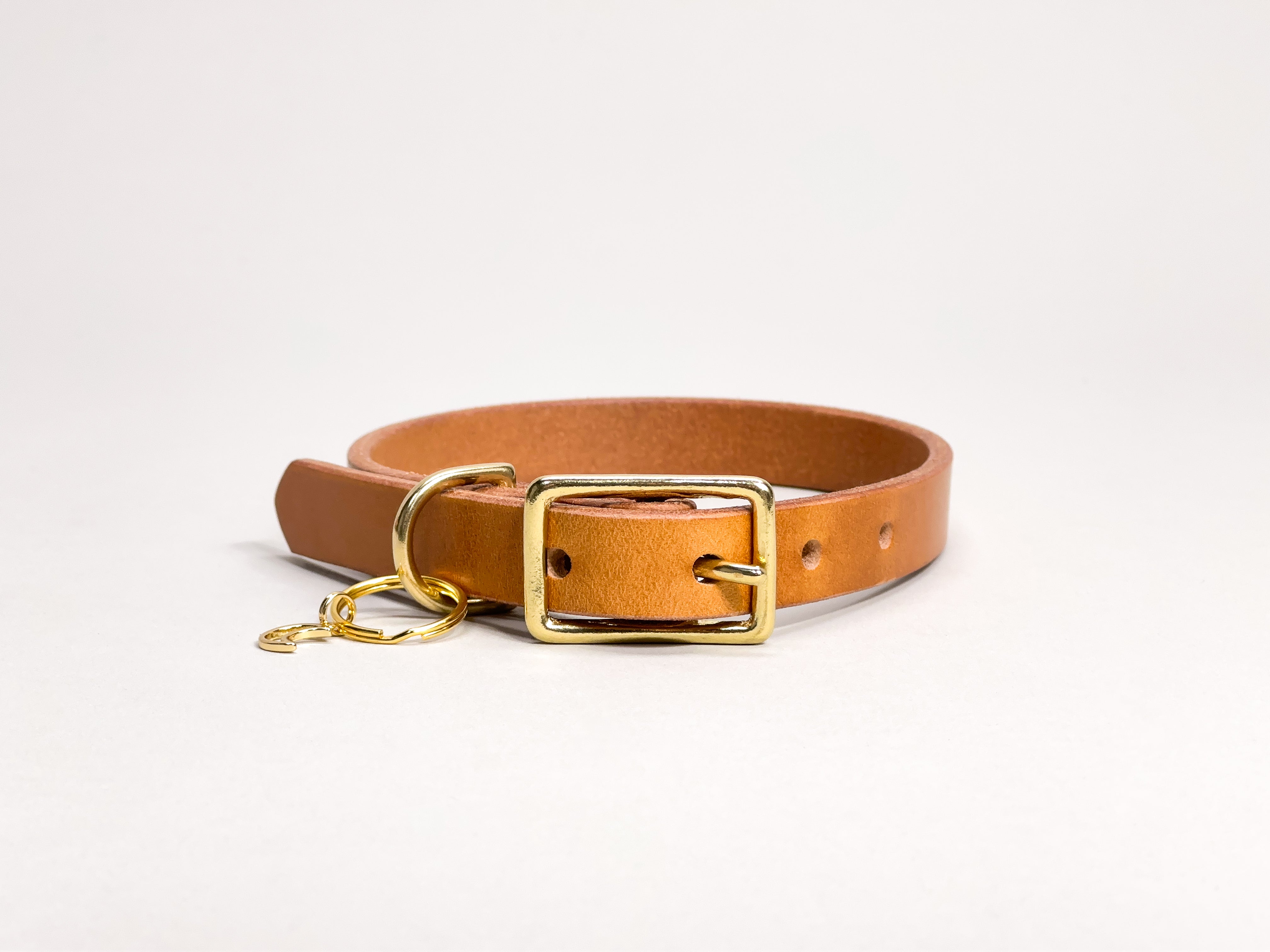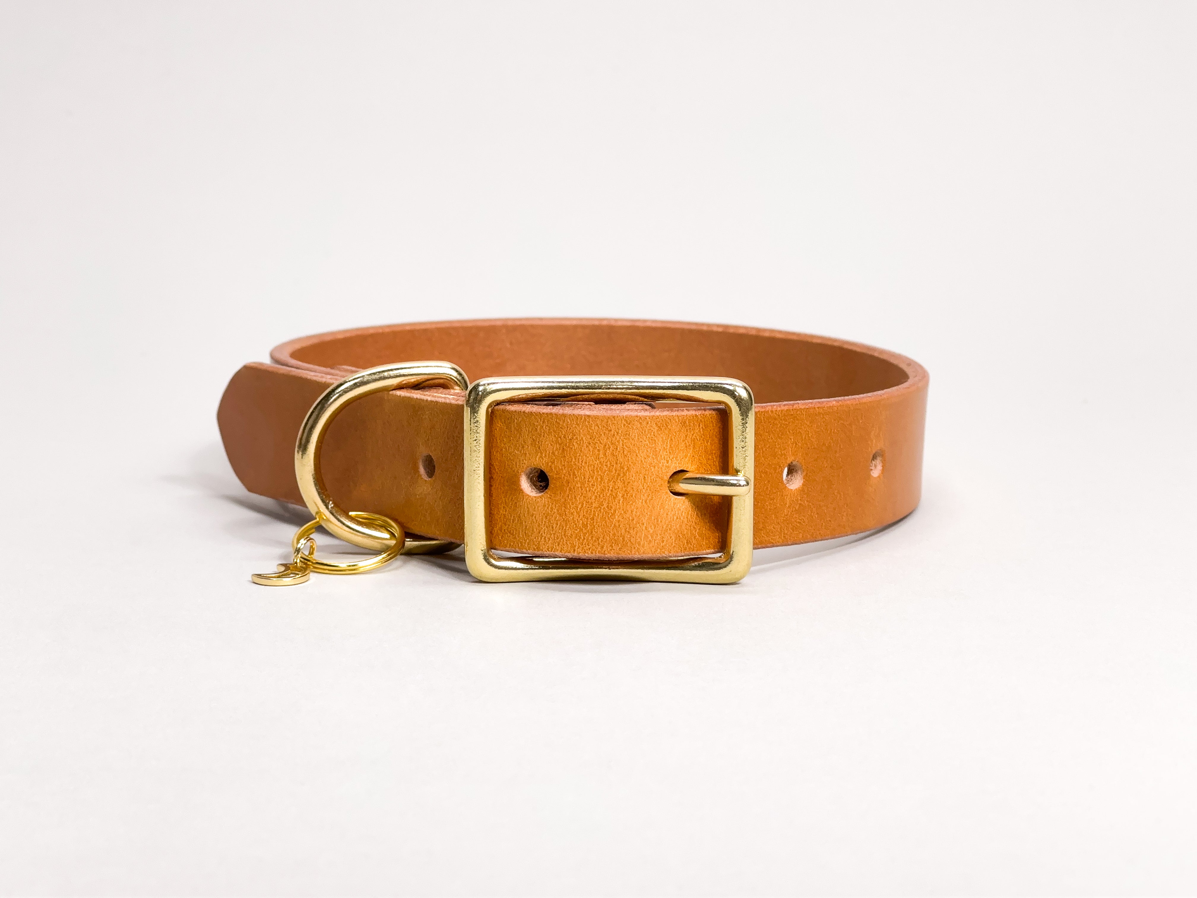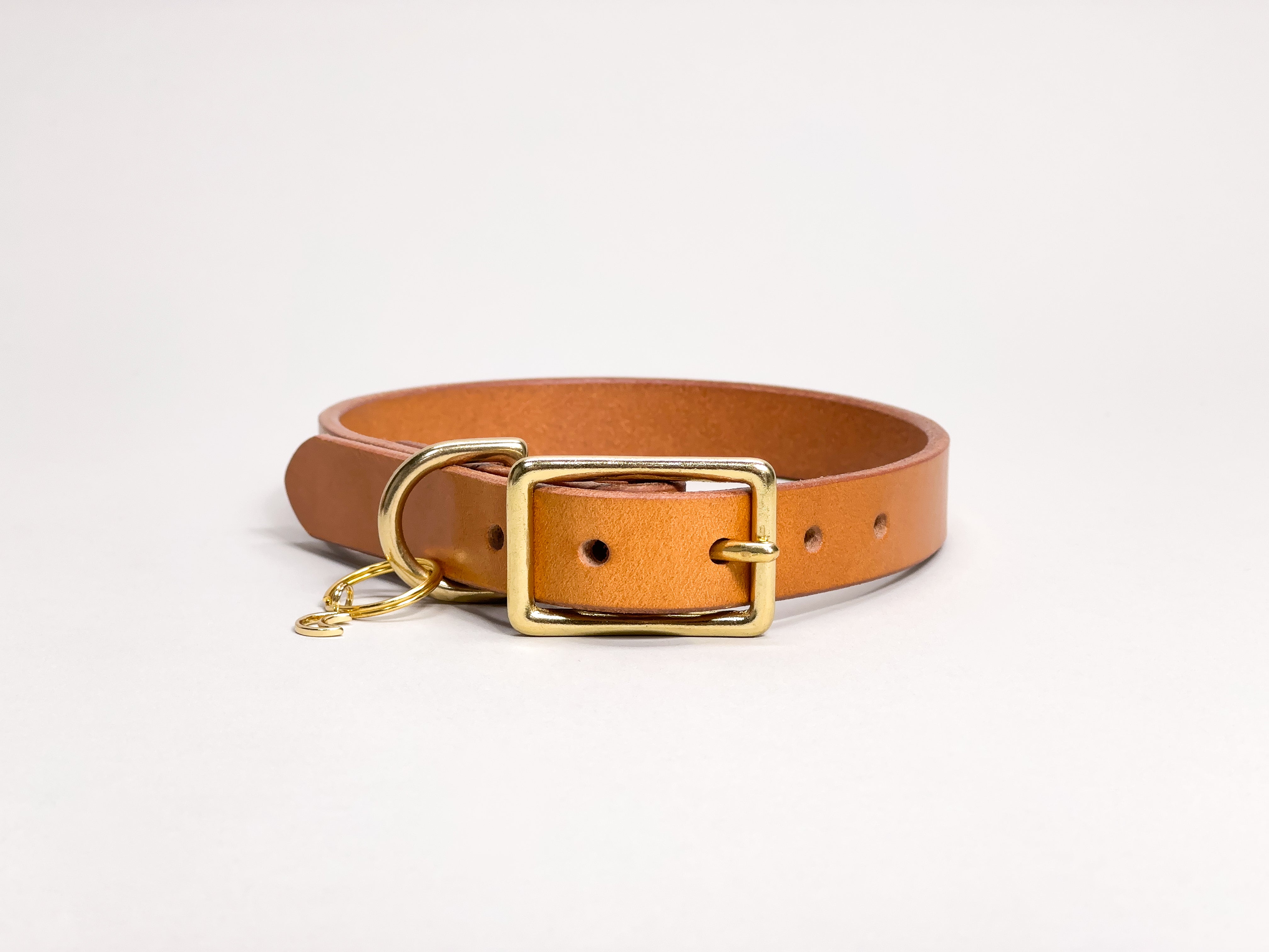 Our Classic Leather Dog Collar features a timeless buckle design. We use solid brass and chrome-plated solid brass hardware, which won't rust over time. All of our collars are finished with a Strange Tails moon charm to match your hardware selection.