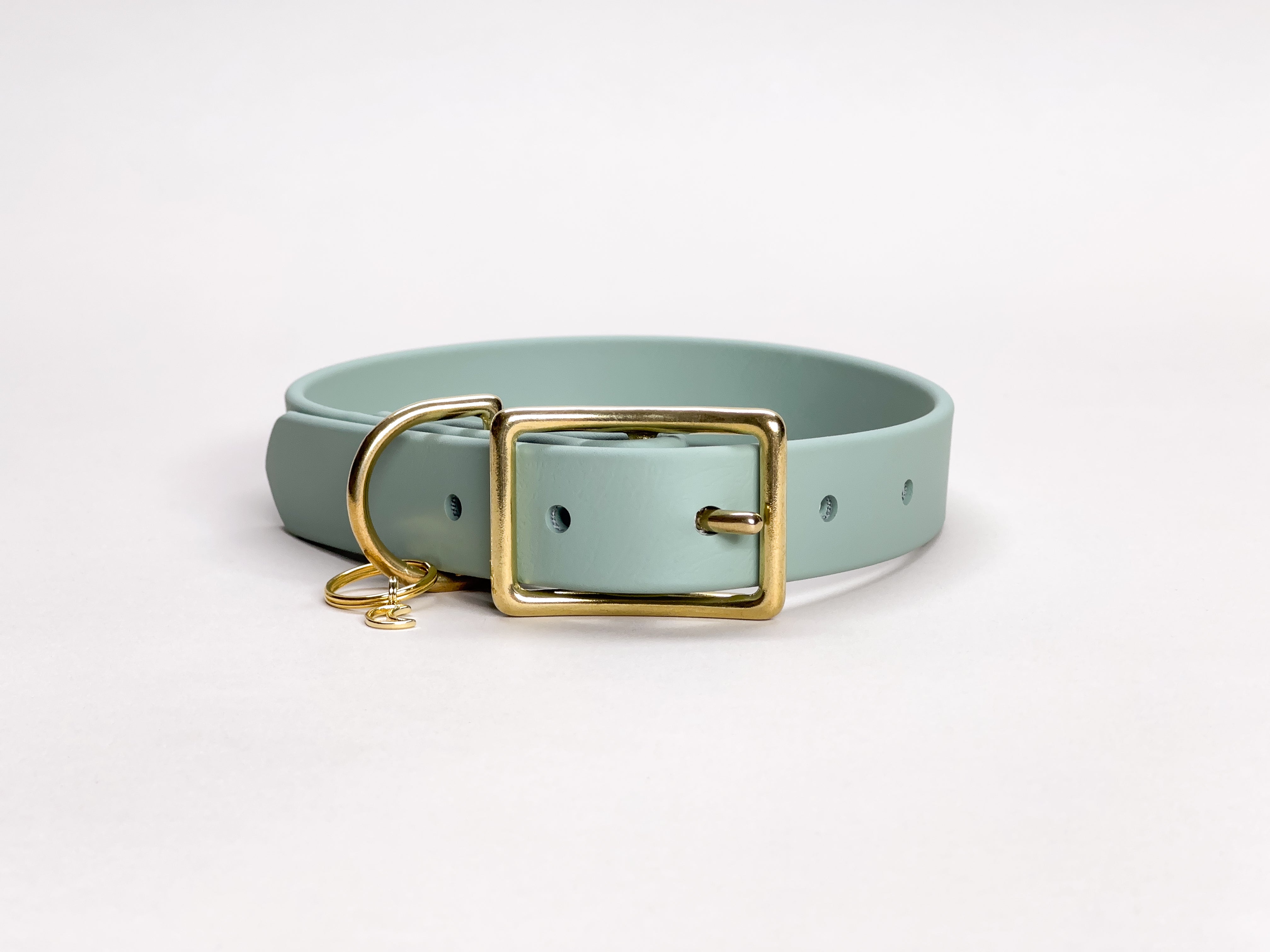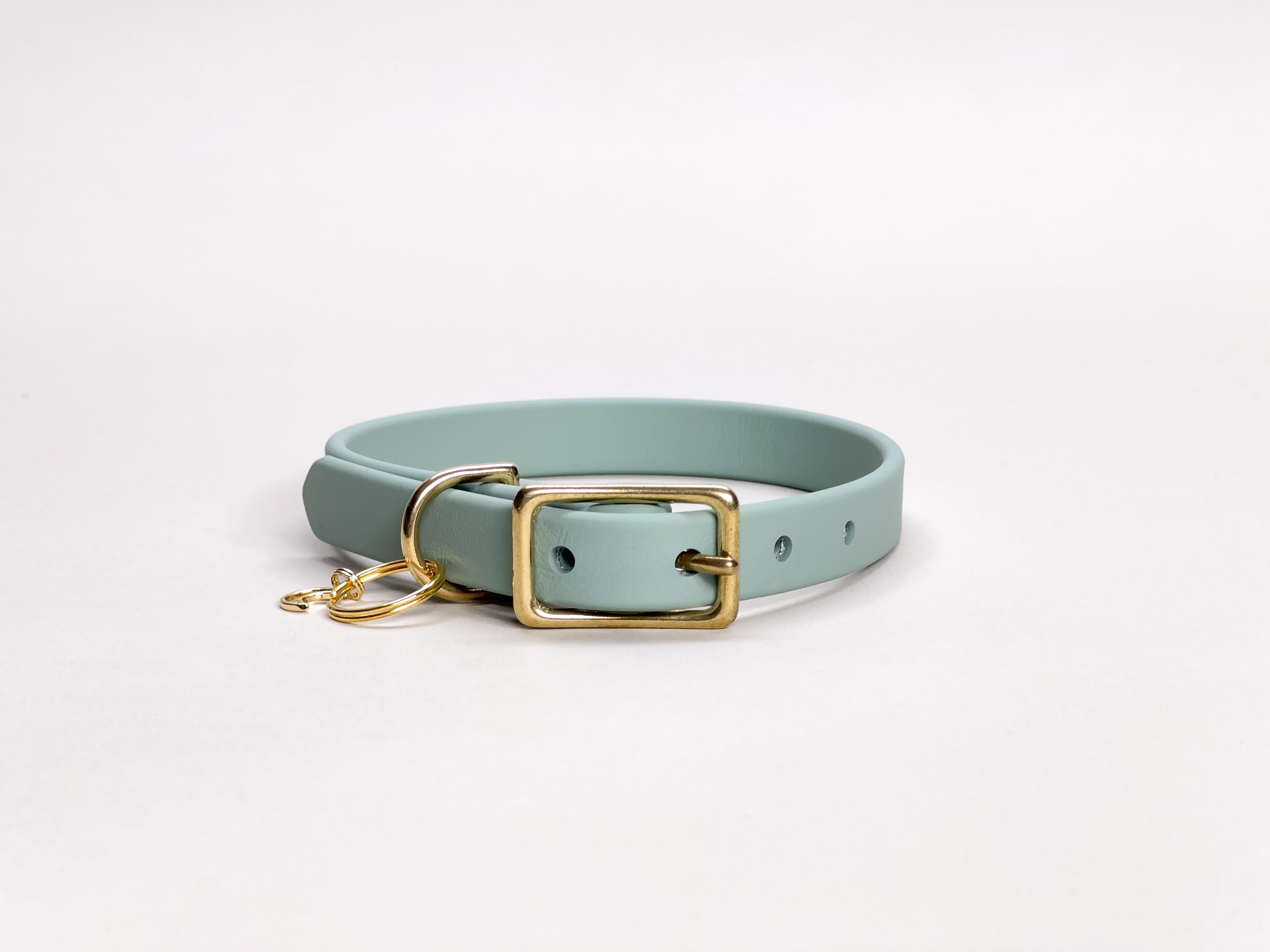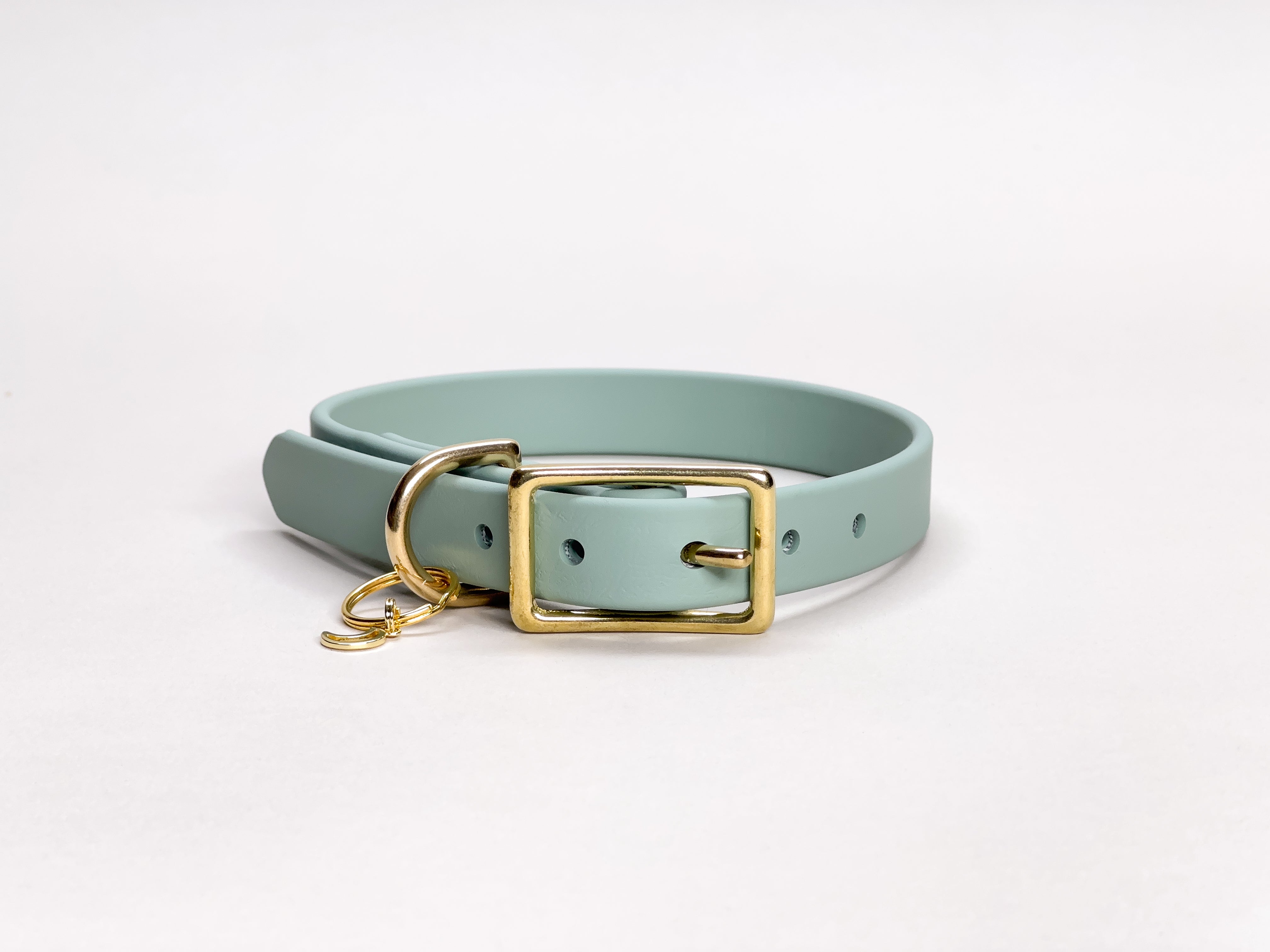 Our Classic Biothane Collar features a timeless buckle design. We use solid brass and chrome-plated solid brass hardware, which won't rust over time.