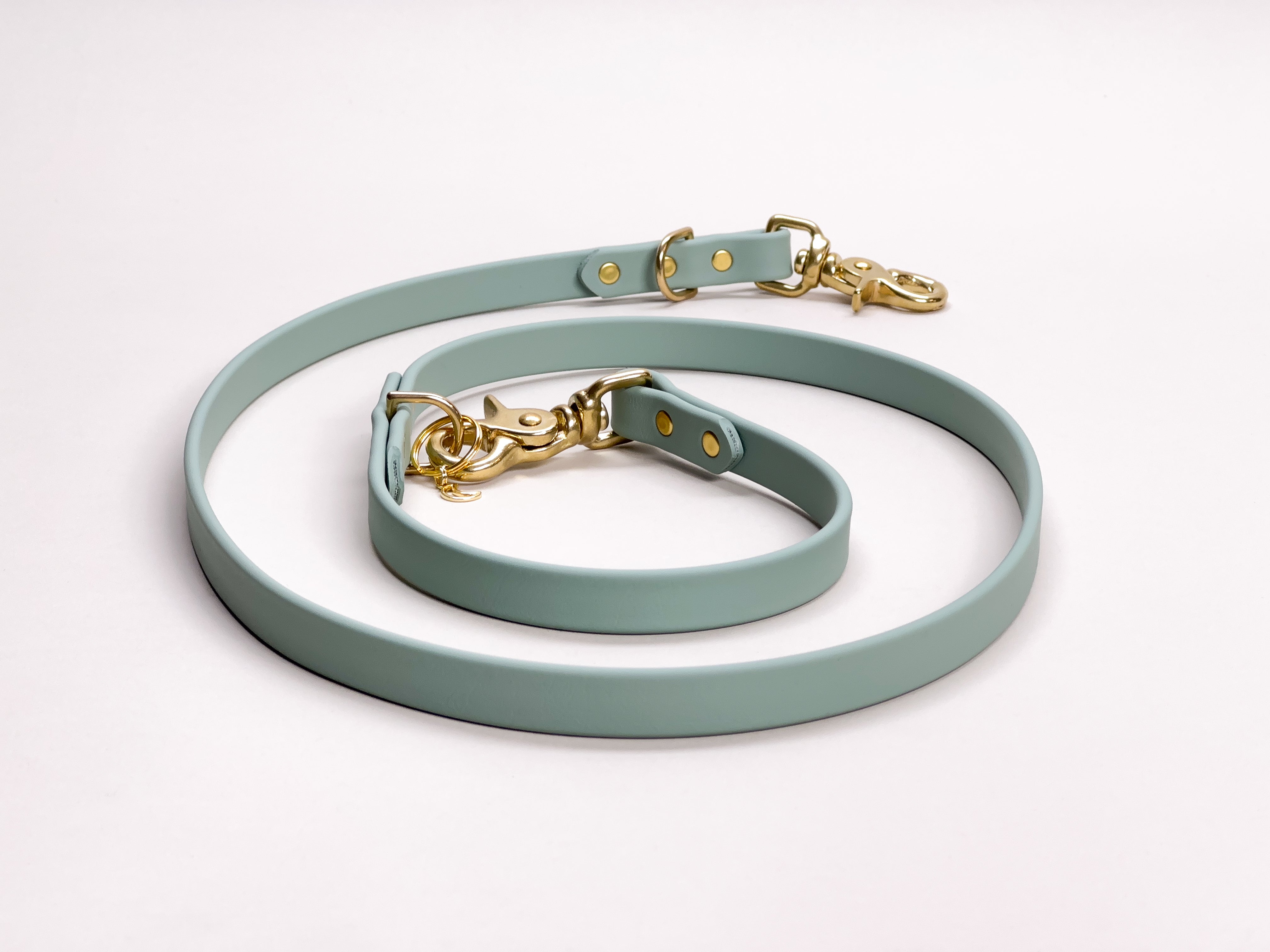 We use the "Super Heavy" Biothane for all of our leashes, handsfree adapters, classic collars and martingale collars which has a substantial and luxe feel to it. Our adjustable quick release collars use the "Standard" Biothane.