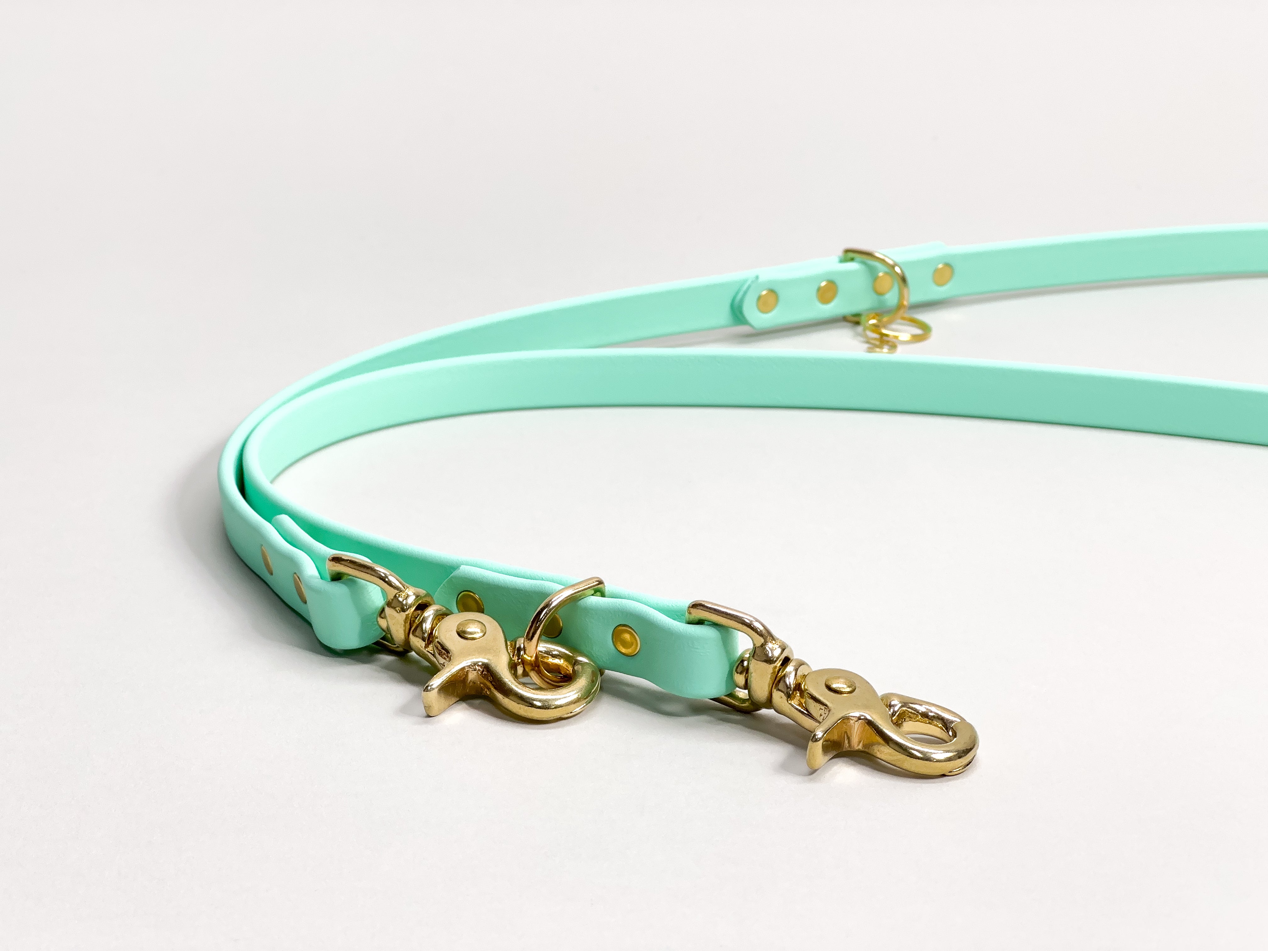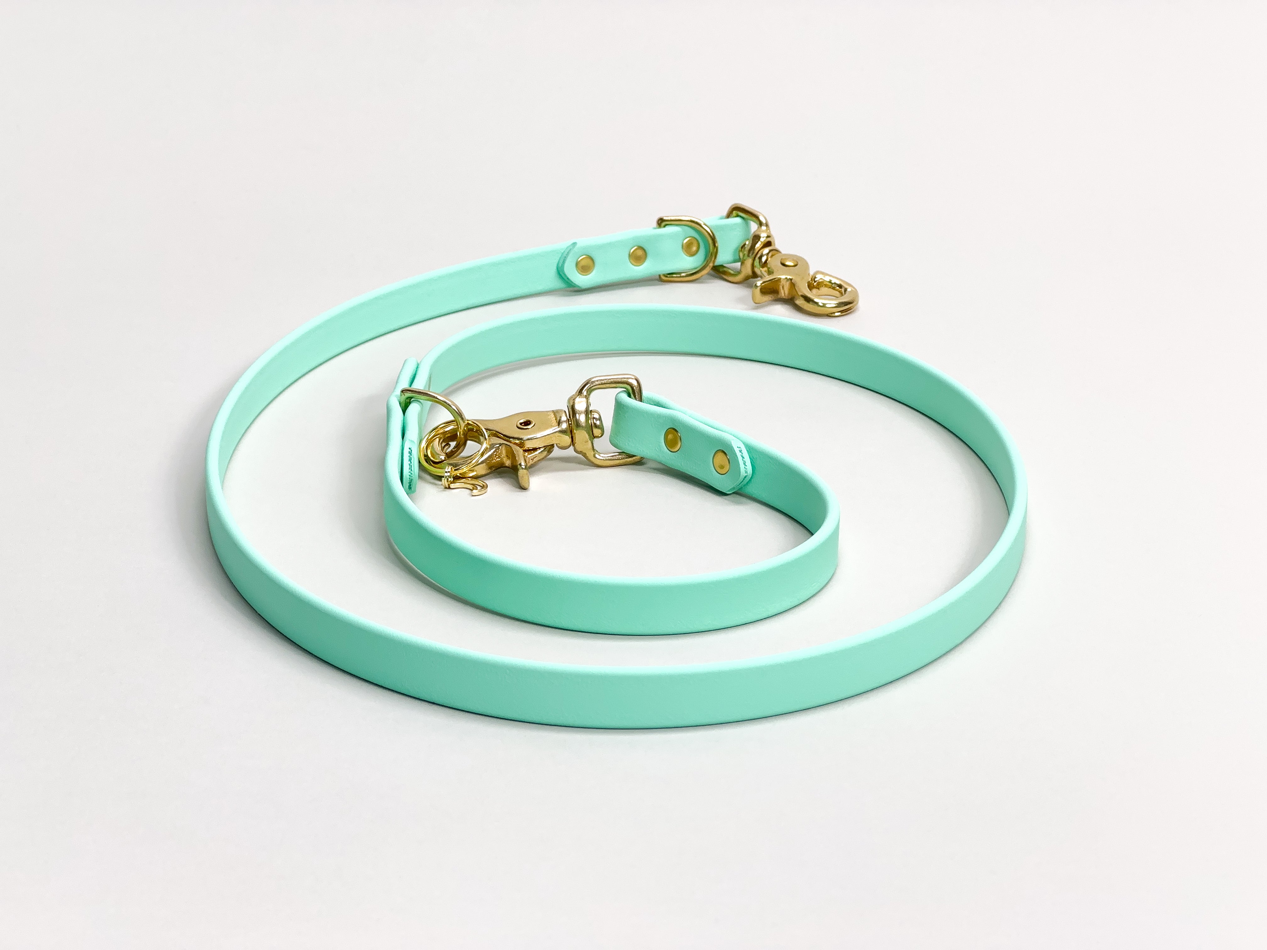 We use the "Super Heavy" Biothane for all of our leashes, handsfree adapters, classic collars and martingale collars which has a substantial and luxe feel to it. Our adjustable quick release collars use the "Standard" Biothane.