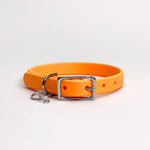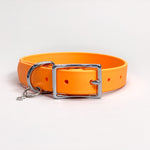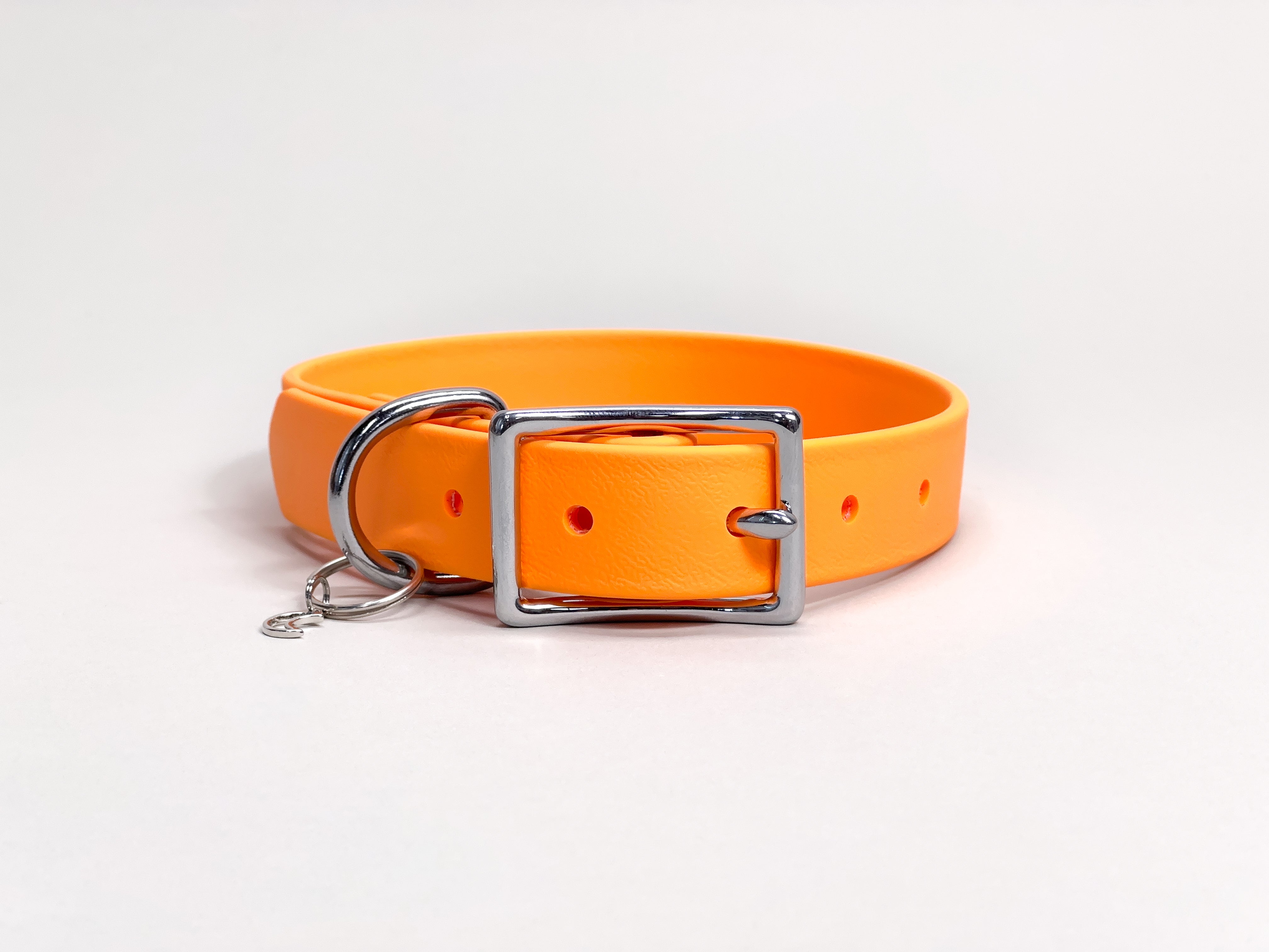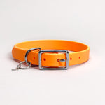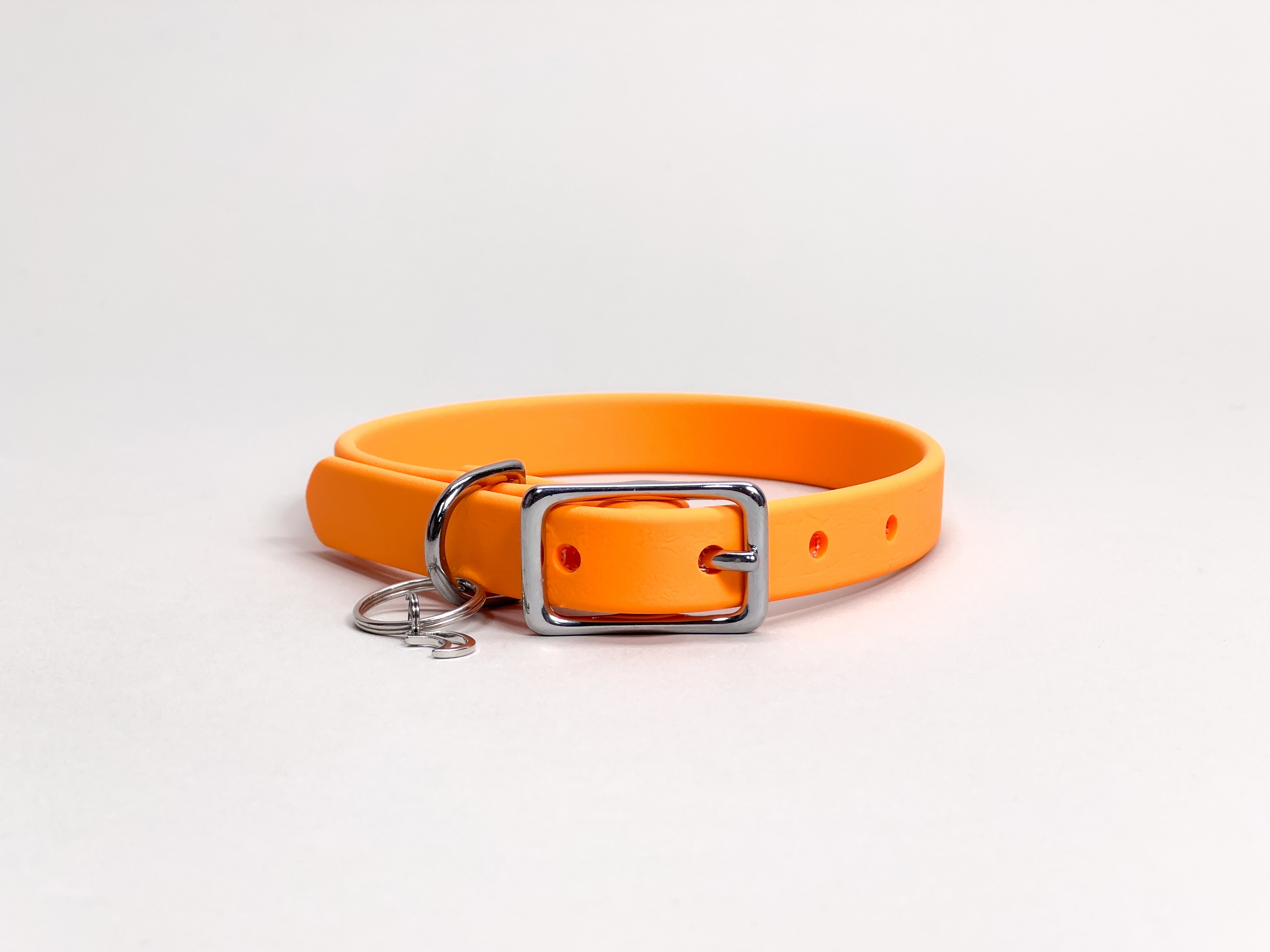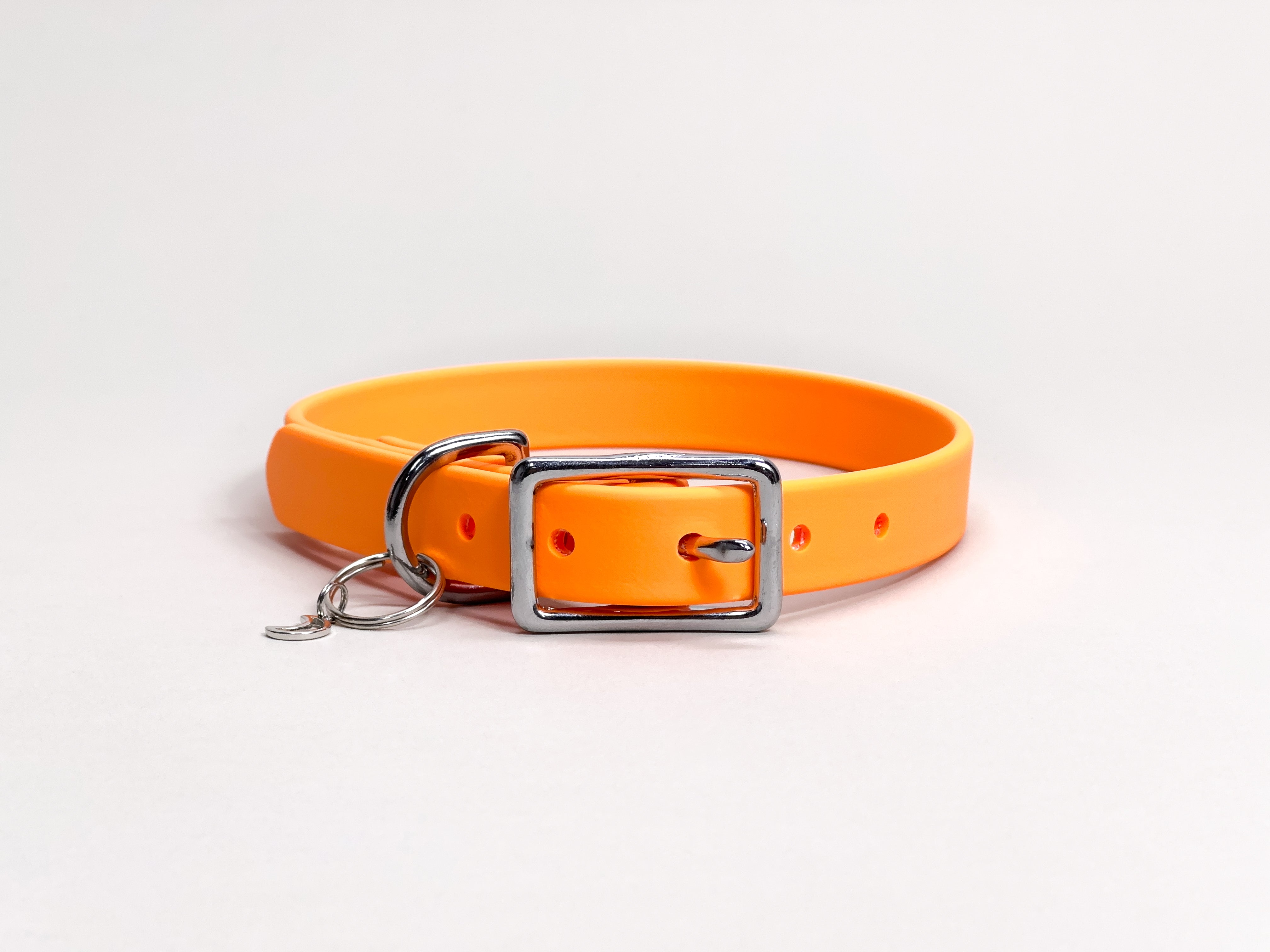 Our Classic Biothane Dog Collar features a timeless buckle design. We use solid brass and chrome-plated solid brass hardware, which won't rust over time.