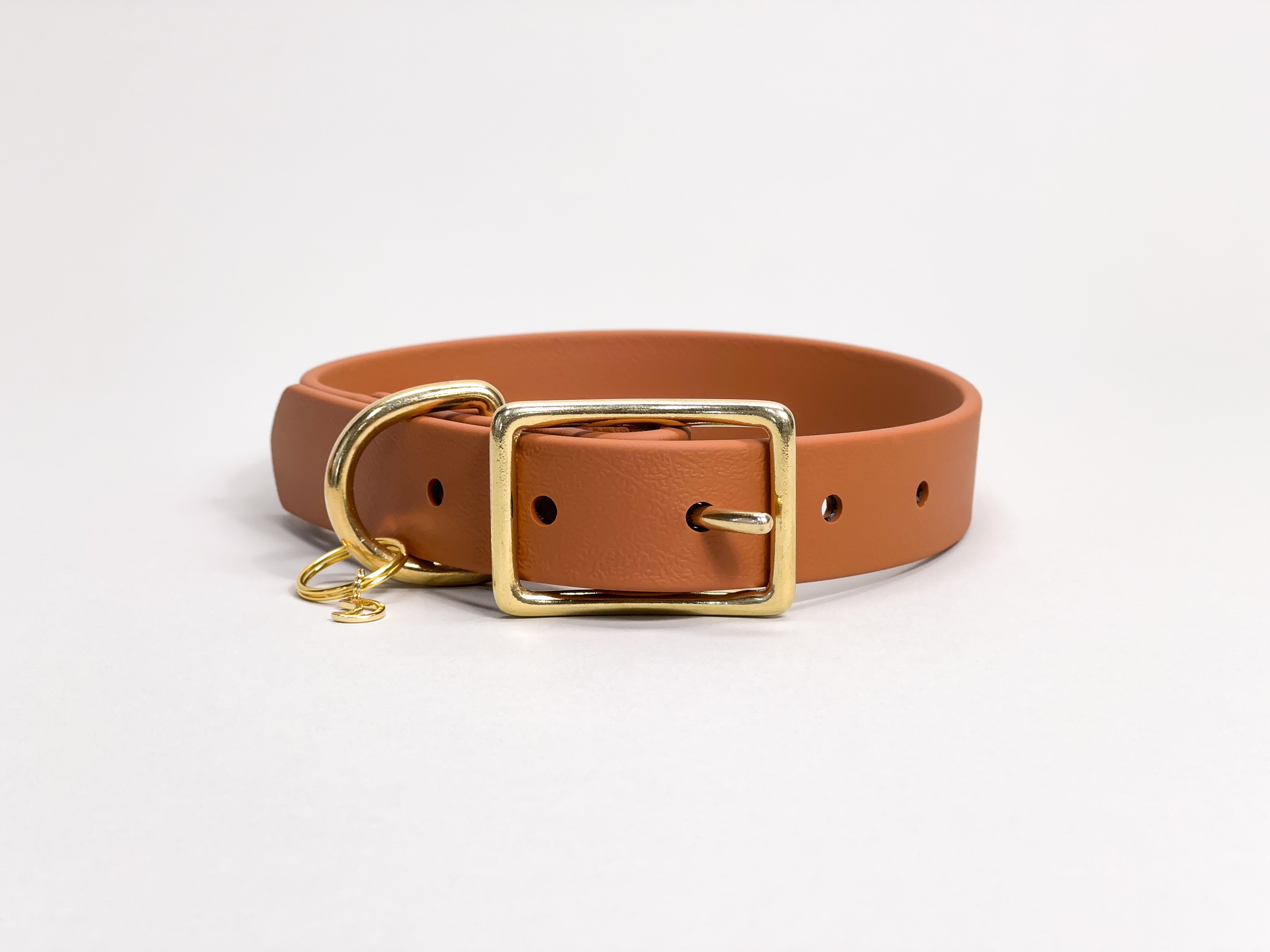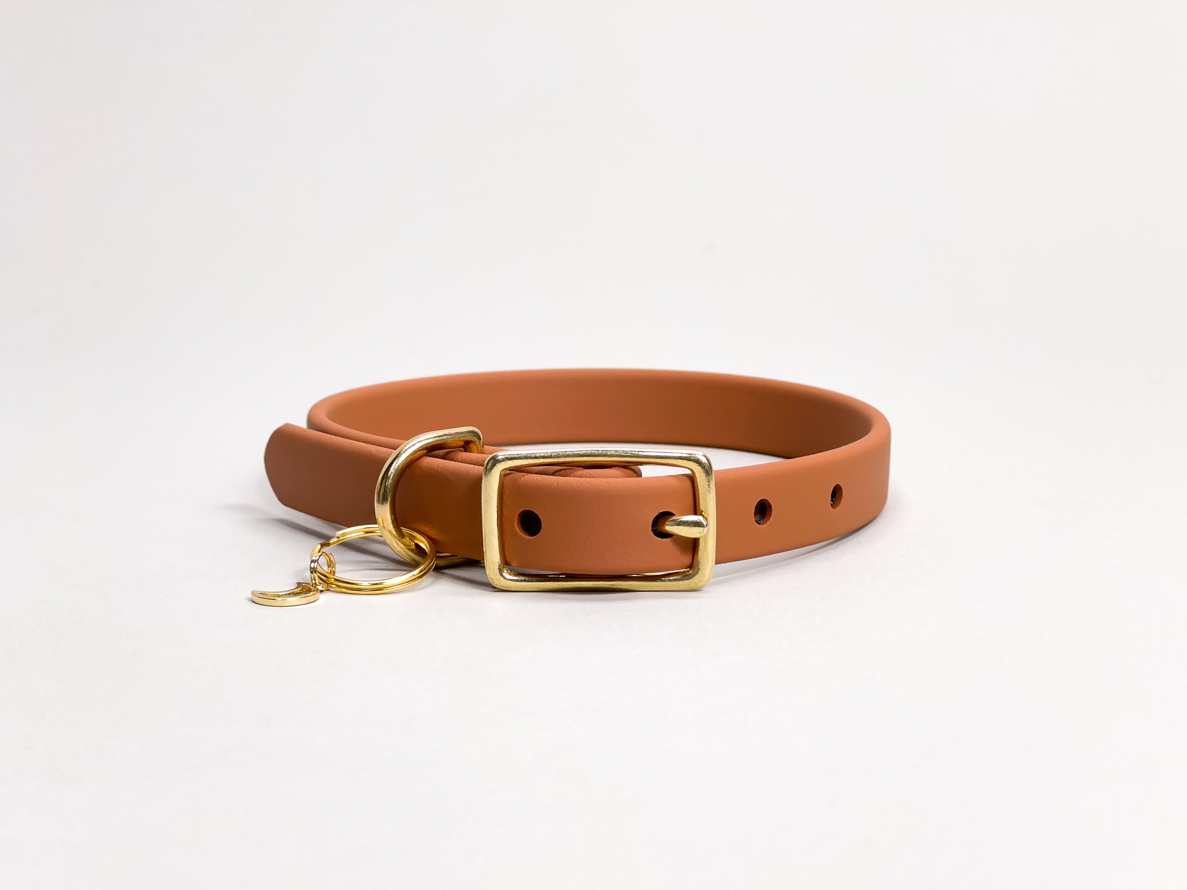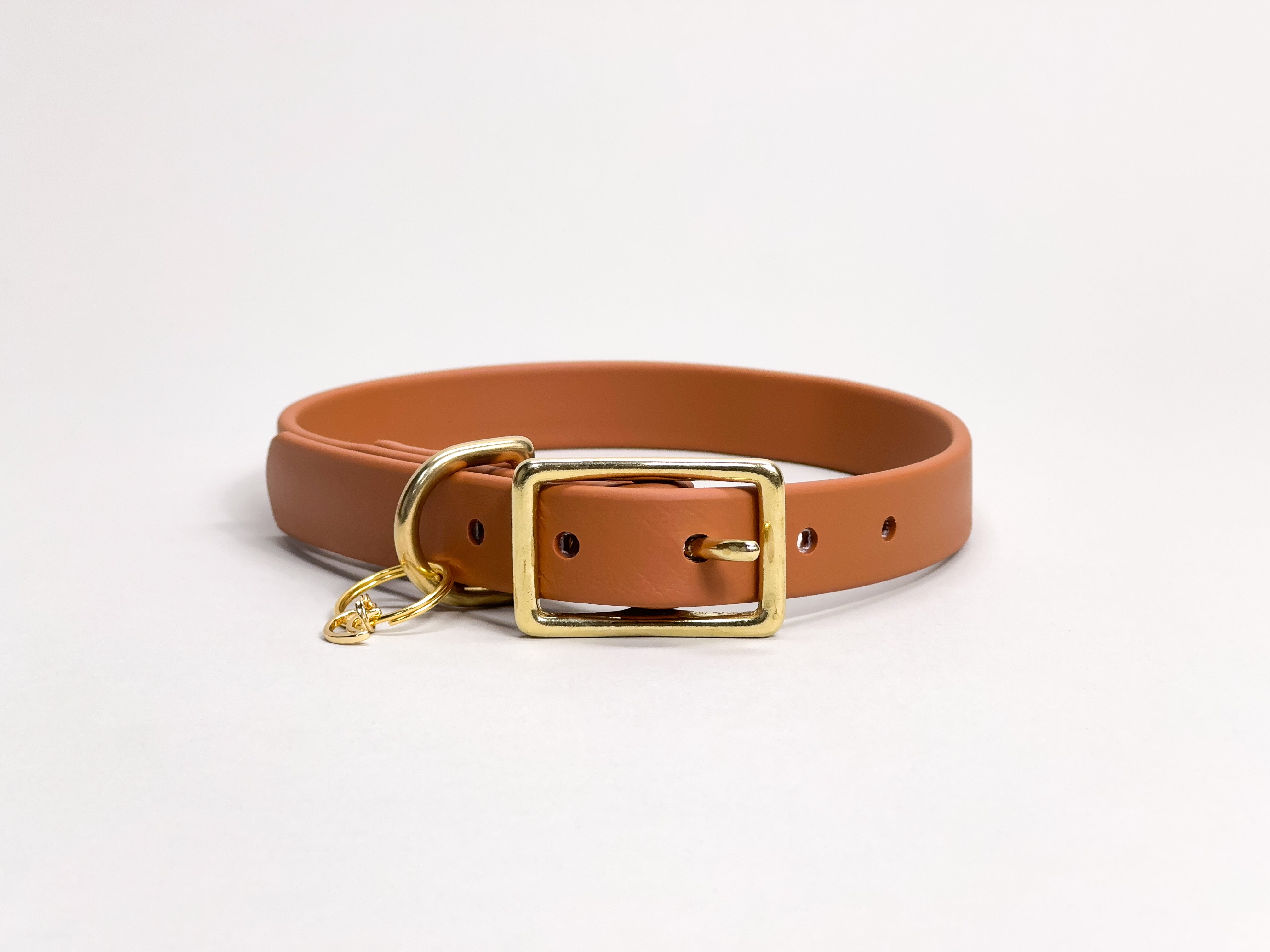 Our Classic Biothane Dog Collar features a timeless buckle design. We use solid brass and chrome-plated solid brass hardware, which won't rust over time.